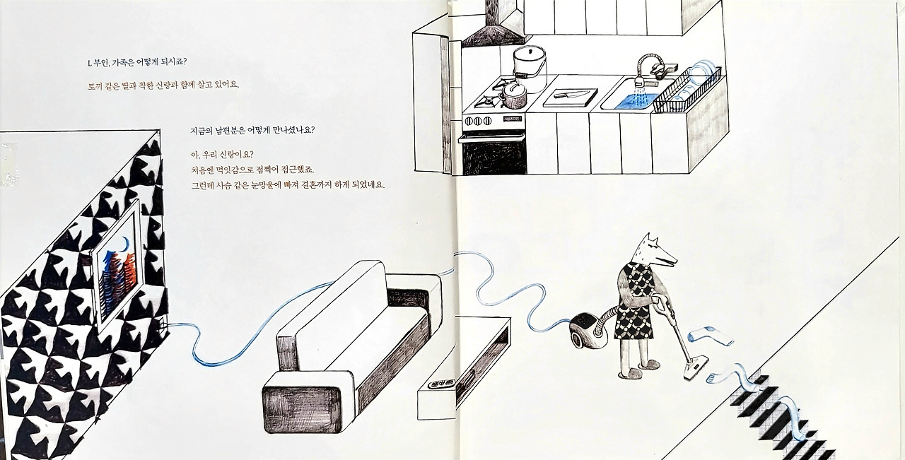 제목처럼 『L부인과의 인터뷰』는 "평범한 사람들의 평범한 하루를 있는 그대로 보여 주는" 인터뷰 형식으로 이야기를 진행한다. 이번 인터뷰의 주인공은 L부인이다. 이름을 묻는 질문에 자신을 그냥 L부인으로 불러달라는 그녀는 한때 잘 나가는 사냥꾼이면서 늑대였다. 지금은 먹잇감으로 찍은 착한 신랑을 만나 토끼 같은 자식을 낳으면서 인간 세상에 적응하는 중이다. 자신의 일을 포기하고, 끝도 없이 이어지는 집안일에 시달리고, 좋아하는 여행도 가지 못하지만 그보다는 가족의 건강과 행복이 우선이다. 물론 보름달이 뜨면 여전히 힘들지만 말이다.