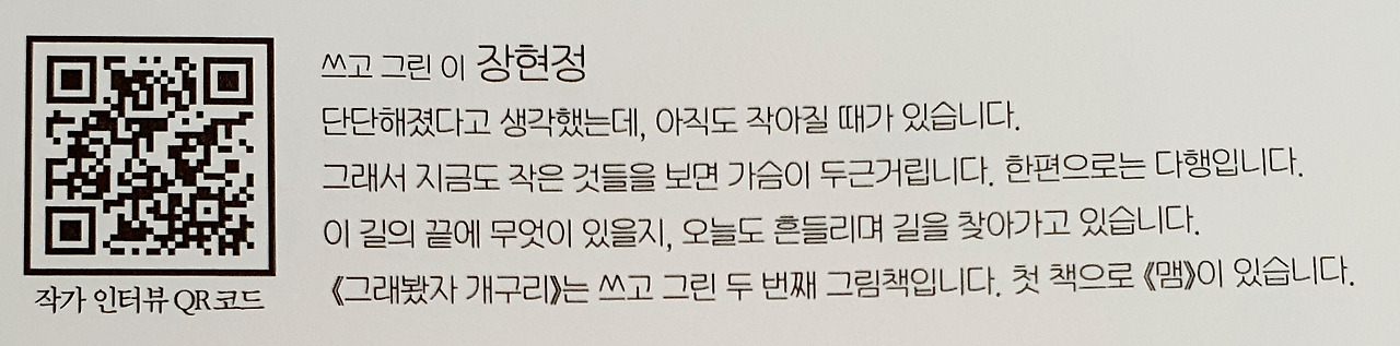 정체성에 대한 고민은 지금도 진행 중이다. 나를 제대로 보려 할 때마다, 인정할 건 인정하려 할 때마다 열등감과 질투심이 방해한다. 자꾸만 나와 당신을 비교하면서 내게 없는 당신의 능력과 감성을 훔치고 싶다. 적자생존의 세상에서 내가 제대로 살아남을지 의문이고, 약육강식의 원리에 따라 나는 소멸할 것만 같다. 괜찮았는데 다시 또 아래로 가라앉고 있었다. 그때 위안이 된 그림책이 『그래봤자 개구리』다.