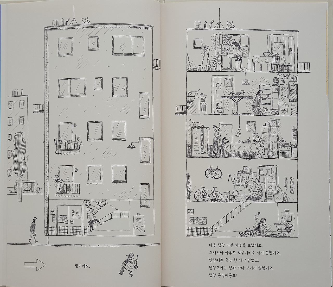 검은색 펜으로만 이루어진 그림에 색이 추가된다. 당근만 있는 앙드레이 할아버지는 주황색, 달걀과 치즈만 있는 네발 아저씨는 노란색 등등 이웃들이 갖고 있는 음식에 맞는 색이 나타난다. 이야기가 진행되면서 각자의 고유한 색이 드러나고 어우러진다. 표지 그림에서 층마다 색깔이 다른 이유를 알겠다.