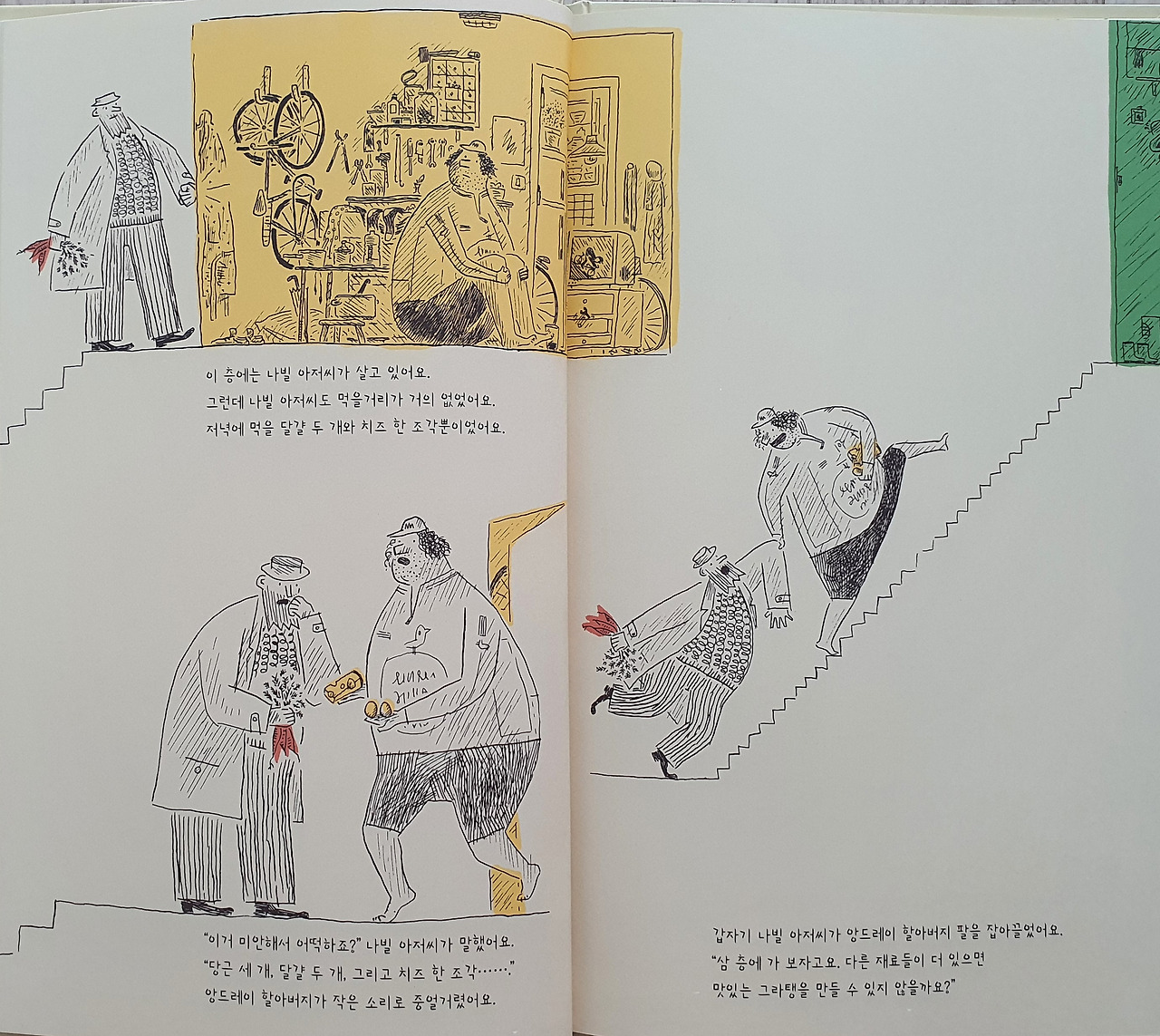 가진 게 없던 내 손을 잡아주던 당신이, 나의 허기를 이해해주고 채워주려 한 당신이, 내가 갖고 있는 말라빠진 당근 세 개가 쓸모 있음을 알려 준 당신이, 자신의 허기를 숨기지 않고 적극적으로 알리고 해결하려던 당신이 이 안에 있었다. 그래서 책장을 넘기는 내내 기분이 좋았다. 앙드레이 할아버지처럼 적극적으로 도움을 요청하지 못했는데 당신은 다 안다는 듯이 내 손을 잡고 문제를 해결하려 했다. 당황해서 끌려가다시피 하는 앙드레이 할아버지와 그런 그를 잡고 성큼성큼 계단을 오르는 나빌 아저씨를 보면서 그때의 나와 당신이 떠올랐다. 그렇게 그들은 위로 위로 올라가 서로의 음식을 합치고 나누리라 예상한 결말은 기대보다 풍성해지더니 한 순간 깨졌다. 반전에 놀랐다가 안도했다가 웃었다. 당신에게 가졌던 감정도 그랬다. 내게 왜 그러는지 놀랐다가 점점 당신이 있어 다행이었다가 결국 고마웠다.