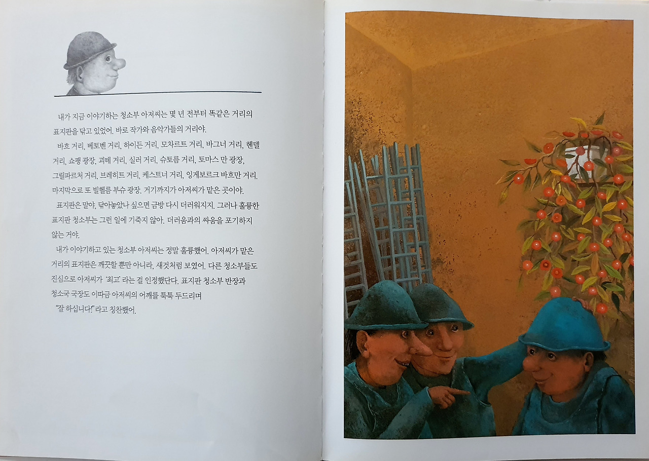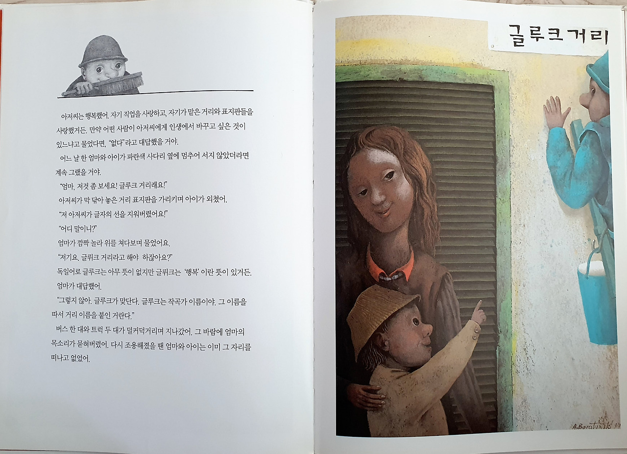 청소부 아저씨는 몇 년 전부터 작가와 음악가들의 거리에서 표지판을 닦고 있다. 아저씨는 금방 더러워지는 표지판을 새것처럼 보이게 할 정도로 열심히 한다. 다른 청소부들 뿐 아니라 청소부 반장과 청소국 국장도 아저씨를 최고라 인정한다. 아저씨는 자기 직업을 사랑하고, 자기가 맡은 일을 사랑한다. 어느 날, 한 아이가 엄마에게 표지판을 가리키며 아저씨가 글자의 선을 지워버렸다고 외친다. '글뤼크(독일어로 '행복'이라는 뜻) 거리'를 '글루크 거리'로 만들었다는 아이의 말에 엄마가 글루크는 작곡가 이름이라고 알려준다. 아저씨는 글루크를 포함하여 자신이 닦는 표지판 속 인물들에 대해 아무것도 몰랐다는 것을 깨닫는다. 그때부터 아저씨는 음악회와 오페라 공연을 보러 다니고, 작가들이 쓴 책을 읽는다. 시간이 흘러도 여전히 표지판을 돌보는 아저씨는 그 위에 새겨진 이름들을 어루만지면서 자기 자신에게 음악과 문학에 대해 강연을 한다. 사다리 위에서 표지를 닦는 아저씨는 알아차리지 못하지만 지나가던 사람들이 걸음을 멈추고 그의 강연을 듣고 있다.