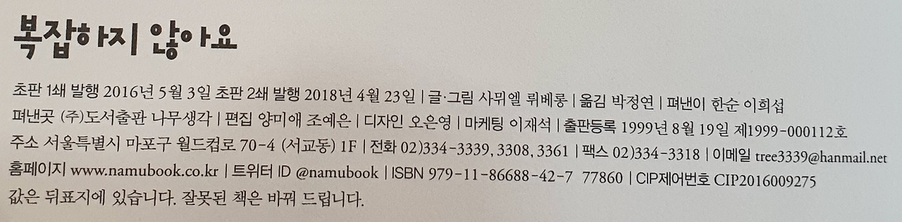 복잡하지 않아요, 사뮈엘 뤼베롱 지음, 박정연 옮김, 나무생각 펴냄