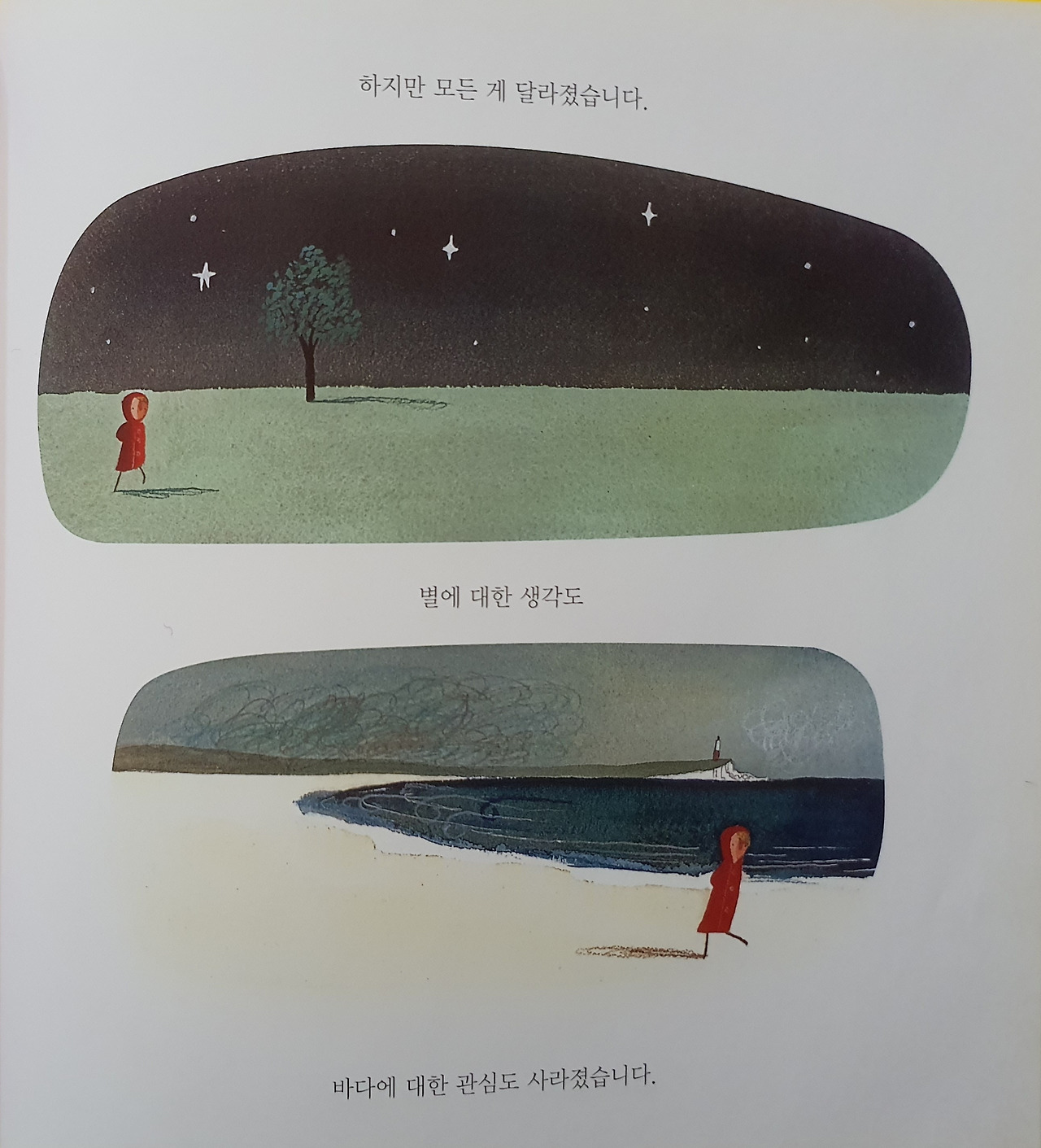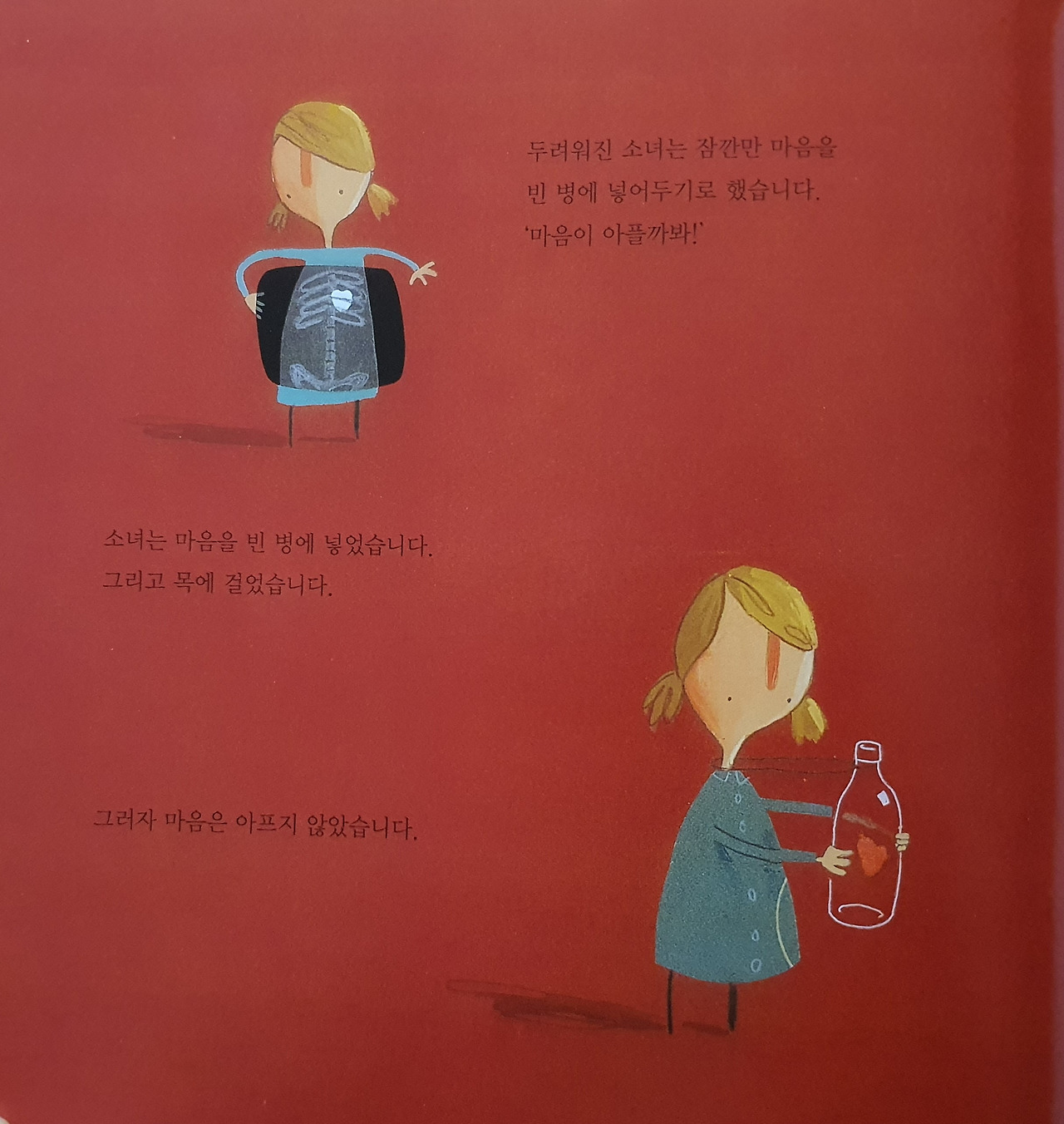 『마음이 아플까 봐』의 소녀는 세상에 대한 호기심이 많다. 소녀의 머릿속은 밤하늘의 별과 바다에 대한 신비로움으로 가득 차 있다. 소녀는 새로운 것을 아는 게 기쁘다. 할아버지의 빈 의자를 보기 전까지는 그랬다. 할아버지를 잃은 소녀는 마음이 아플까 봐 자신의 마음을 빈 병에 넣는다. 그러자 마음이 아프지 않다. 마음은 안전한데 별과 바다와 세상에 대한 관심이 없어진다. 소녀는 무엇을 해야 할지도 모르겠다.