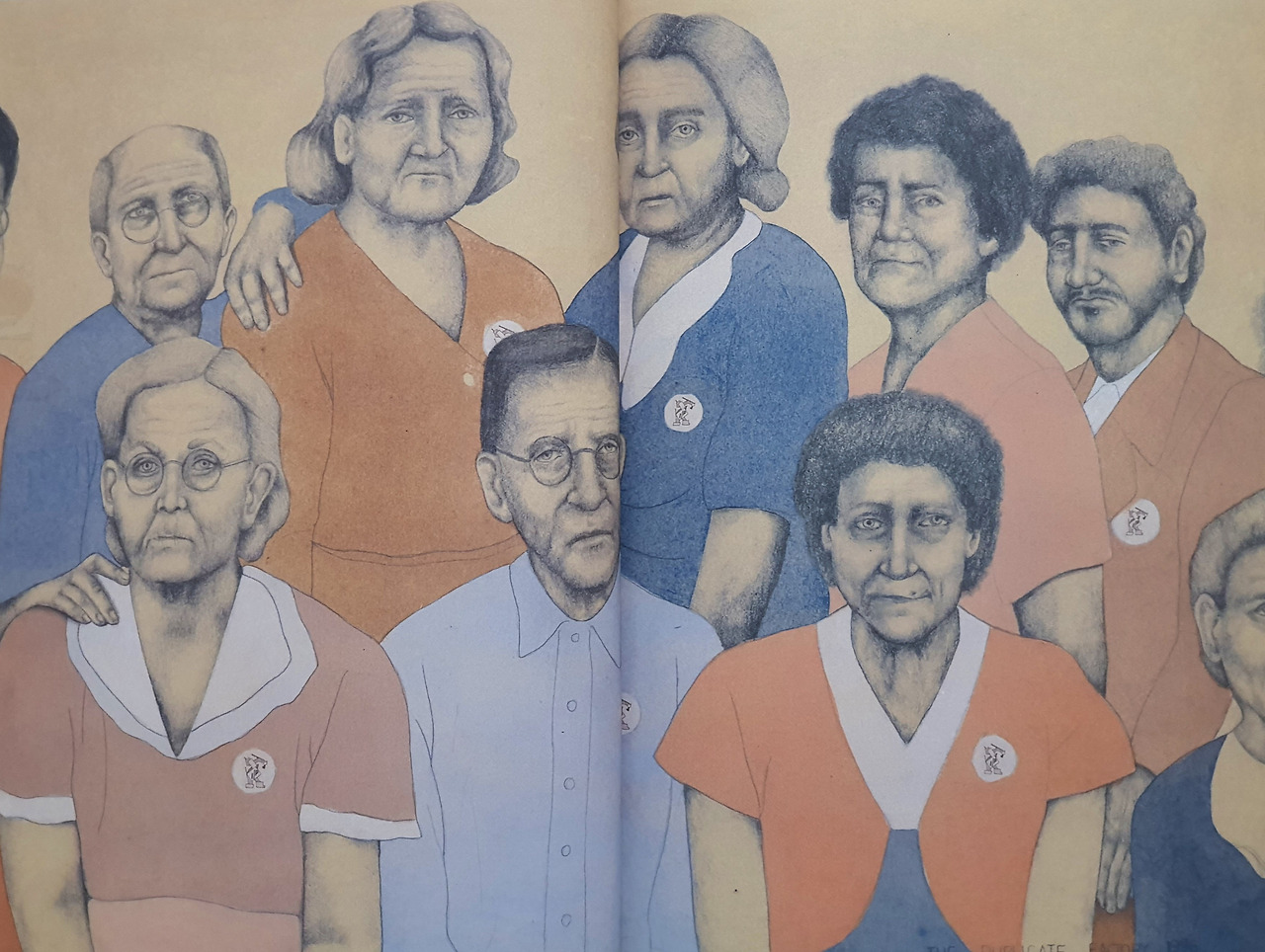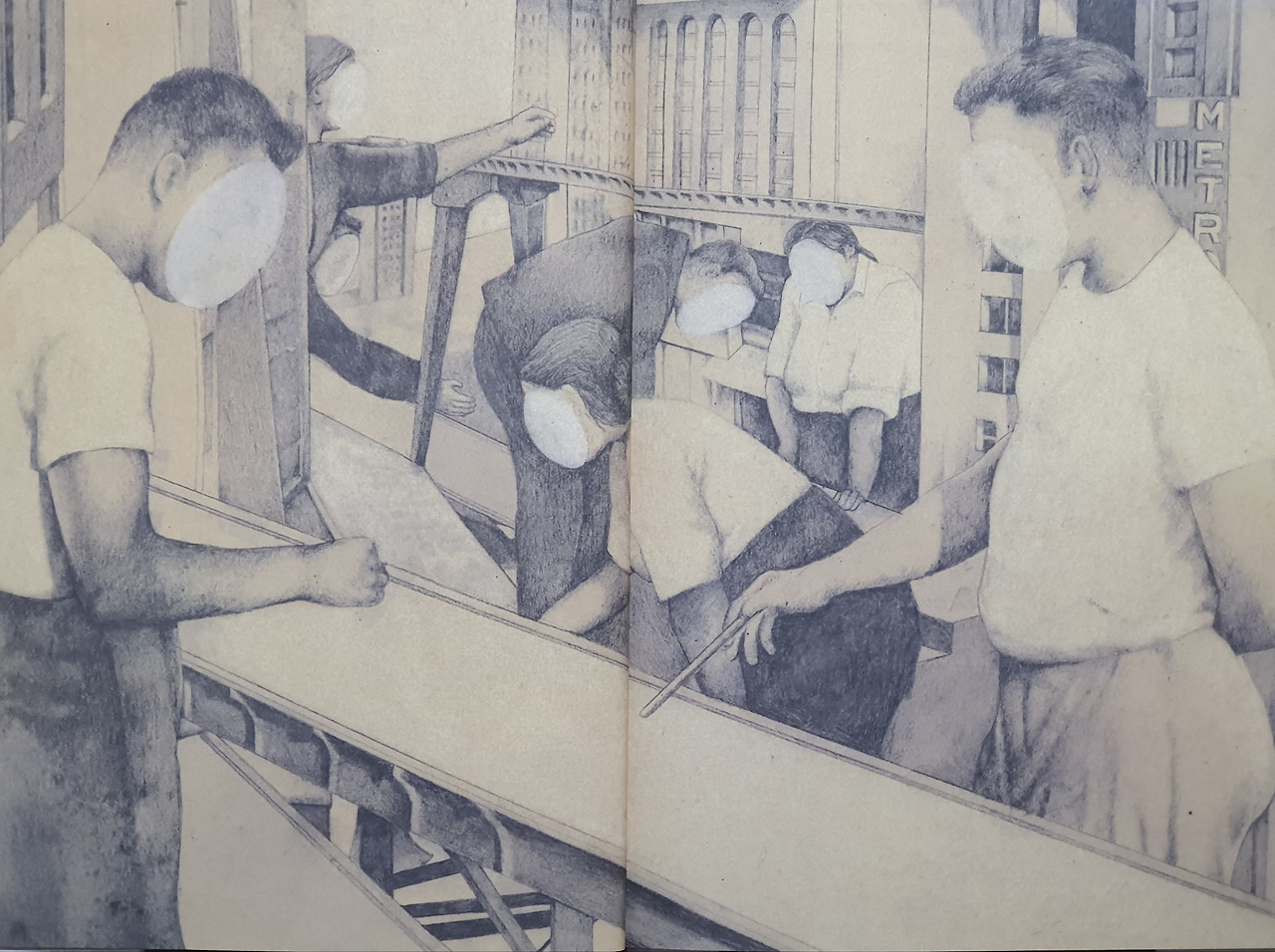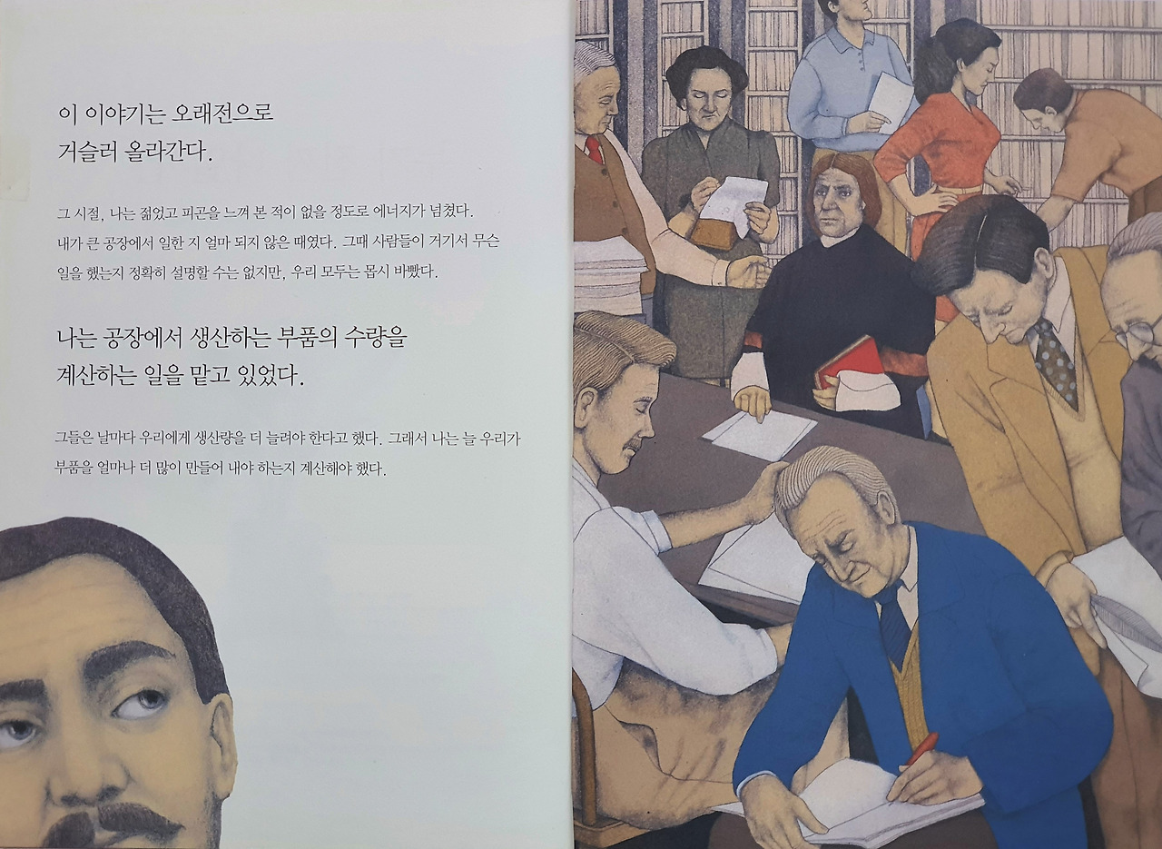읽는 내내 머리를 한 대 얻어맞은 듯했다. 내용도 내용이지만 그림을 볼 때마다 헉, 소리가 나왔다. 직원들은 무서울 정도로 표정이 없다. 살아있는 자의 얼굴로 보이지 않는다. 마스크가 얼굴 전체를 가려 감정을 볼 수 없는가 하면, 입술이 견출지로 가려져 있기도 하다. 똑같은 옷을 입고 똑같은 헤어스타일을 한 여자들은 웃고 있지만 인위적인 표정 때문에 기괴하다. 눈을 내리 깔고 한참 아래에 있는 '나'를 쳐다보는 사장과 고개를 들어 사장에게 얼굴을 보이지만 눈을 맞추지 못하는 '나'를 통해 그들의 관계를 알 수 있다. 컨베이어 벨트 위로 쓰러져 톱니바퀴 장치까지 끌려가는 공장 직원의 몸과 화면 전체를 채우고 있는 사장의 구두는 압권이다. 내 몸이 눌리고 찢기는 건 아닌지 두렵기까지 하다. 무엇을 생산하는지도 모른 채 강요당하는 그들이, 사장의 무리한 요구를 거절하지 못하는 그들이, 나는 대체 누구인지 확신하지 못하는 그들이 남 같지