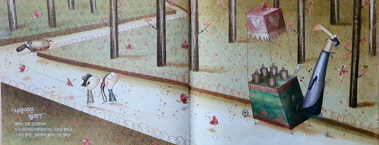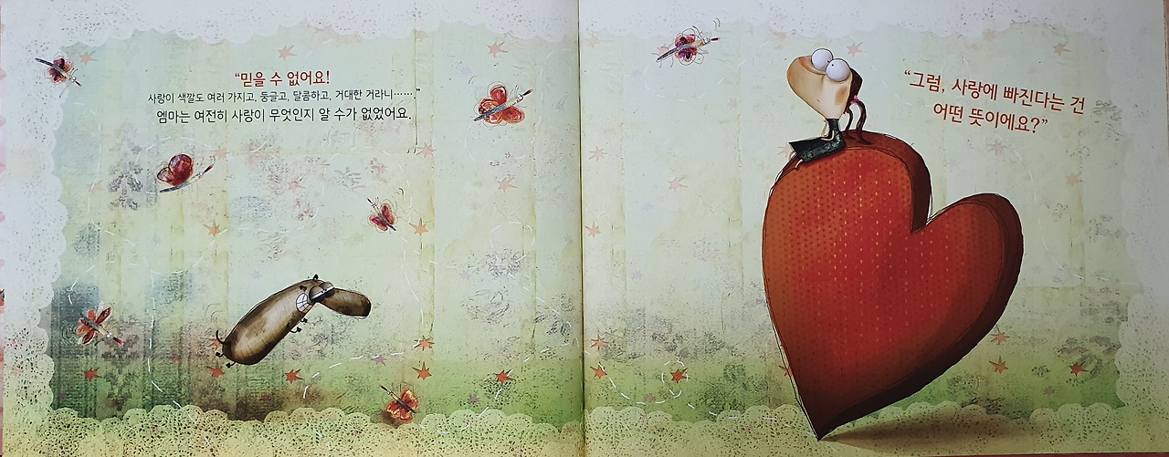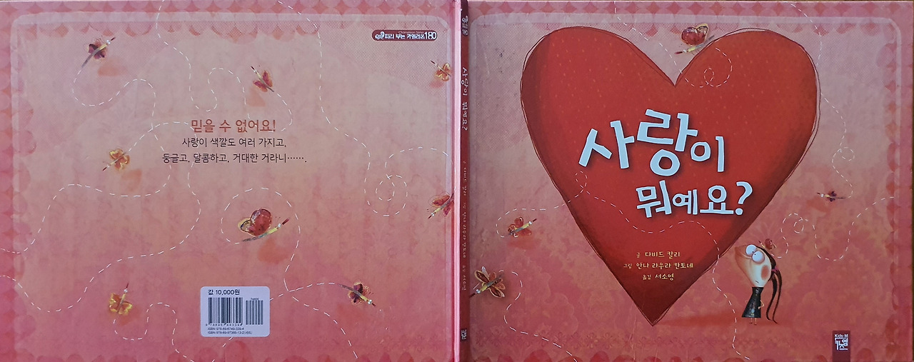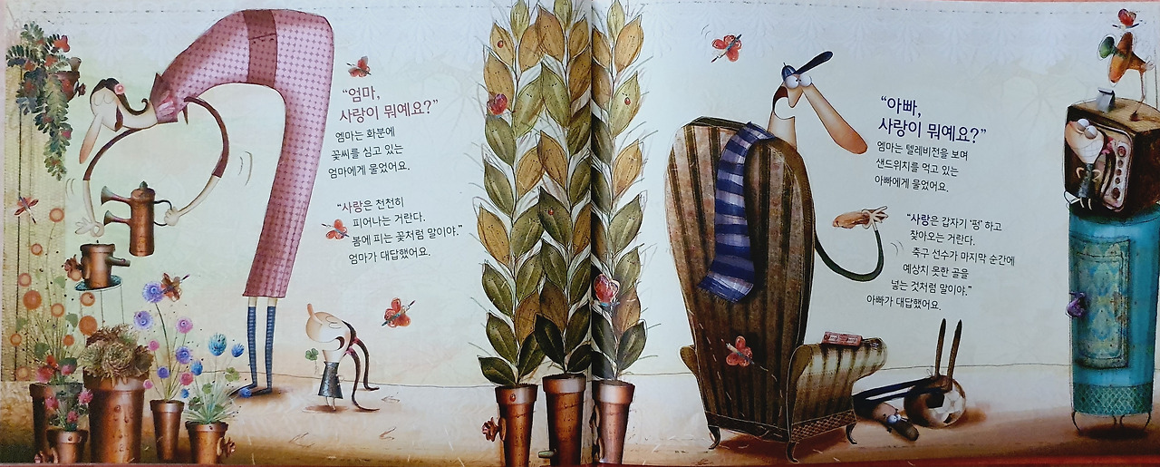 『사랑이 뭐예요?』를 찾을 때에도 기대는 하지 않았다. 몇 년 전에 딱 한 번 읽고 덮어버린 그림책이었다. 처음 읽었던 그 날, 별다른 감흥이 없었기에 그 후로 꺼내지 않았다. 내용이 기억나지 않았지만 딱히 더 읽고 싶지는 않았다. 그랬던 이 책을 다시 펼친 이유는 어린아이의 시선으로 바라본 사랑이 궁금해서였다.