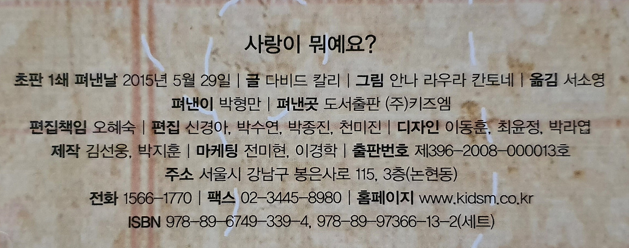 * 사랑이 뭐예요? 다비드 칼리 글, 안나 라우라 칸토네 그림, 서소영 옮김, 키즈엠 펴냄