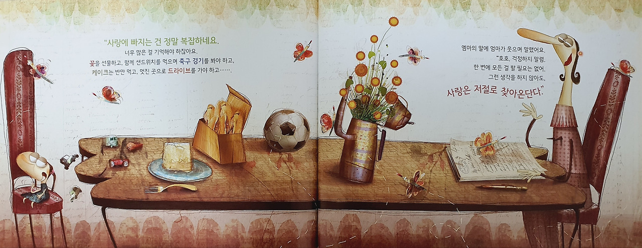 간단하고 명료할 줄 알았는데 들으면 들을수록 어렵고 복잡하다. 사랑의 모습은 너무나 다양하고 제각각이어서 하나로 종합할 수가 없다. 기억해야 할 것도 너무 많다. 꽃도 선물해야 하고, 함께 샌드위치를 먹으면서 축구 경기도 봐야 하고, 하나밖에 없는 케이크도 나눠야 하고, 함께 드라이브도 가야 한다. 사랑에 대해 들을수록 물음만 커지는 엠마가 나와 똑같다. 다른 게 있다면 엠마는 순수한 호기심이고, 나는 이미 정해놓은 결론에 긍정을 더하는 작업이라는 점이다.