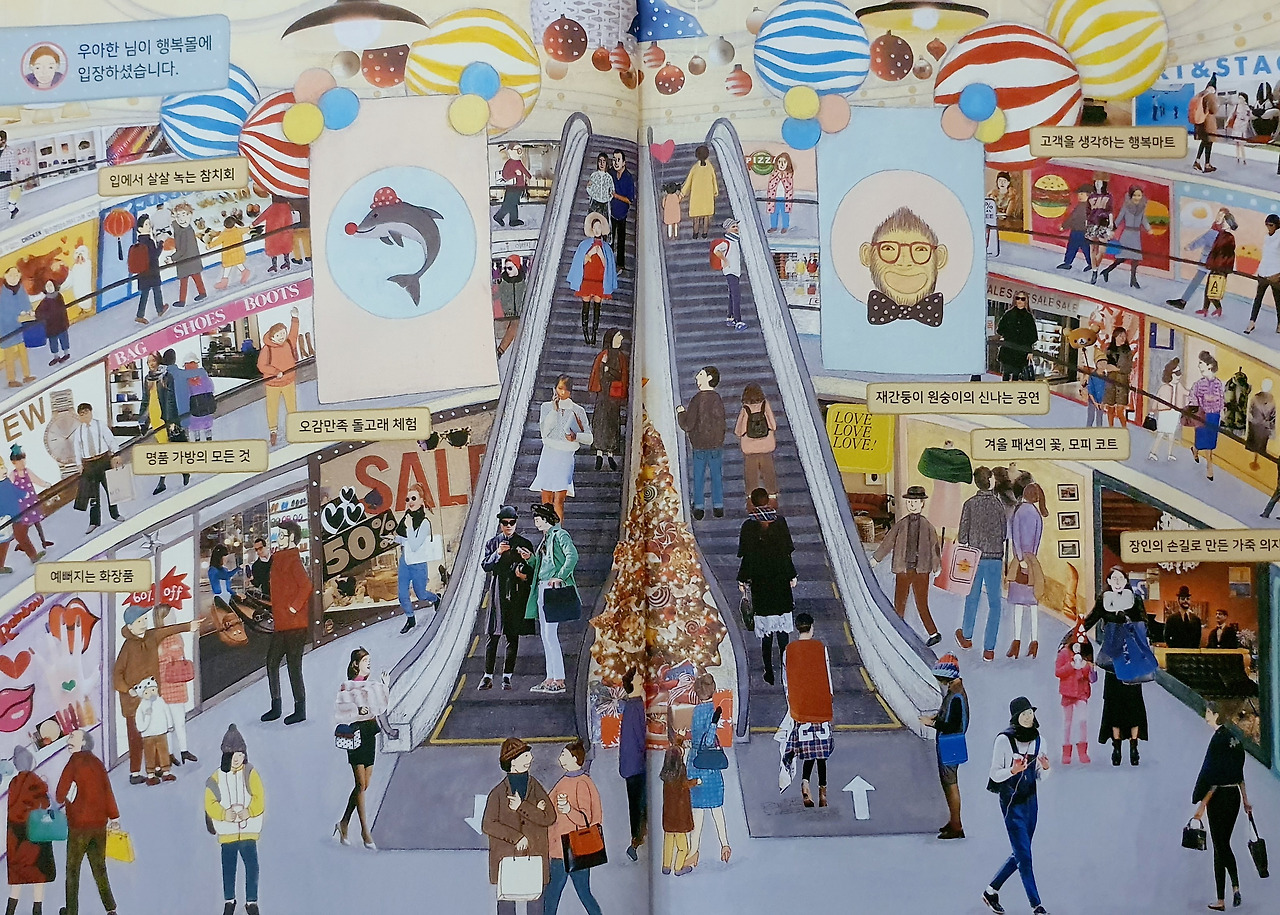 우아한 가족이 행복몰에 입장한다. 행복몰은 명품 가방, 화장품, 의류, 가구, 동물 공연, 다양한 먹을 거리 등 오감을 자극하는 모든 것을 갖춘 대형 쇼핑몰이다. 색색의 풍선과 반짝이는 조명이 이곳에 입장하는 사람들에게 환상을 제공한다. 무표정한 얼굴로 통화를 하거나, 대화를 나누는 사람 몇 명을 제외하면 이 곳에 있는 사람 대부분은 웃고 있다. 우아한과 그녀의 남편 고품격과 그들의 아들 역시 이곳에서 멋진 하루를 보낸다. 우아한의 가족은 악어가죽으로 만든 빨간색 가방, 걸치기만 해도 우아한 밍크코트, 숙련된 장인이 만든 명품 소가죽 의자, 왕실에서 사용한다는 명품 향수 등을 구입한다. 물건뿐 아니라 돌고래와 원숭이 쇼에 즐거워하고, 참치와 고기의 맛에 감동한다. 이 즐거움과 감동을 혼자 알고 싶지 않아 우아한과 고품격은 자신들이 무엇을 사고, 무엇을 보고, 무엇을 맛보는지 SNS에 올린다. 게시물에 달린 댓글과 '좋아요'가 행복에 행복을 더한다.