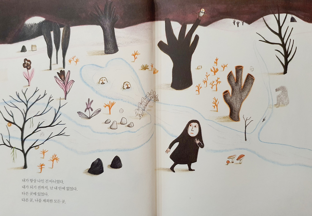 은유와 상징이 난무하는 이야기는 몇 번을 곱씹은 뒤에야 이해할 수 있었다. 그림은 곳곳마다 기괴하고 우울한 수수께끼를 품고 있었다. 주인공 '나'는 얼굴과 손을 제외한 몸을 검은색 망토와 신발로 감췄다. '나'의 꿈들인 나무는 손가락이 잘린 손처럼, 온전하게 자라지 못한 사람의 몸처럼, 예민하게 반응하는 신경세포처럼 보였다. 문장과 그림을 읽을 때마다 마음이 격렬하게 움직이다가 이내 차분하게 가라앉았다. 그리고 다시 요동치면서 나를 흔들었다. 난해하지만 이해가 가고, 이해하다가도 의문투성이인 그림은 나와 당신을 닮았다.