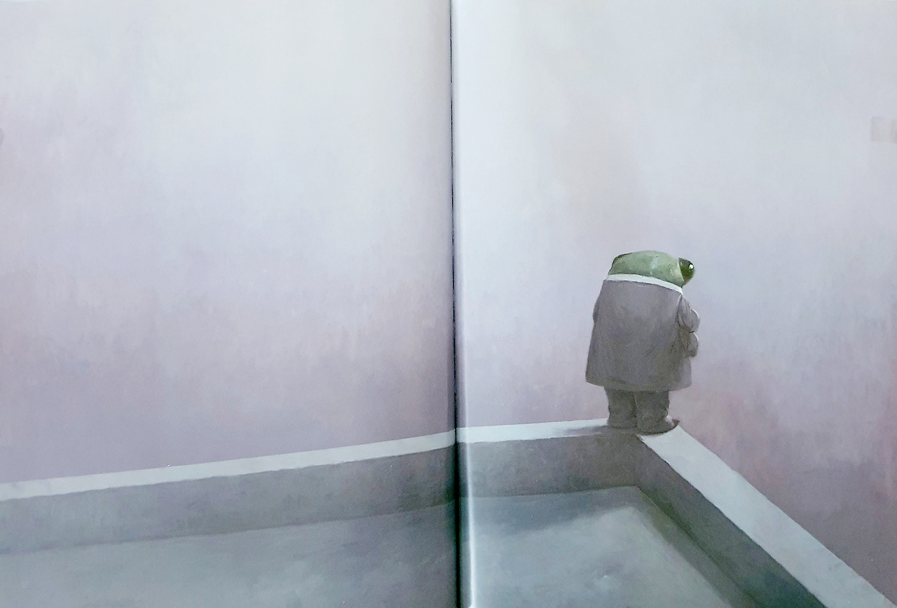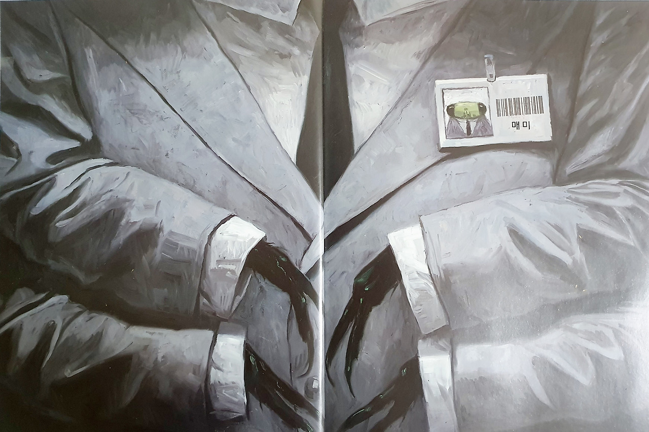 『매미』는 짧은 문장으로 핵심만 전달하고 있습니다. 감정을 배제한 채 별 것 아니라는 듯이 툭툭 내뱉지요. 반복되는 '톡 톡 톡!'이 너무 경쾌해서 비정하기만 합니다. 그 문장이 그림과 만나면 헉, 소리가 납니다. 아무도 없는 넓은 사무실에 홀로 앉아 늦은 시각까지 일을 하는 매미, 뒷짐을 지고 돌아선 인간에게 다리를 가지런히 모으고 서 있는 매미, 인간의 구둣발에 배를 밟힌 채 버둥거리는 매미, 인간의 키에 맞게 설계되어 있어 아무리 다리를 뻗어도 엘리베이터 버튼을 누를 수 없는 매미의 모습이 아무렇지 않다는 듯 무심하게 던지는 글과 만나면 탄식이 나옵니다. 엘리베이터를 타기도 힘든 매미가 길을 열두 번이나 건너야 하는 공중화장실로 가려면 어떤 고충을 겪어야 하는지, 매미가 잠시라도 자리를 비우면 인간들이 무슨 꼬투리를 잡을 것인지, 퇴사하는 날까지 인간들이 매미를 어떻게 대했을지, 그때마다 매미의 기분은 어땠을지 등등은 이 책에 없습니다. 그런데도 그 부분이 저절로 그려집니다.