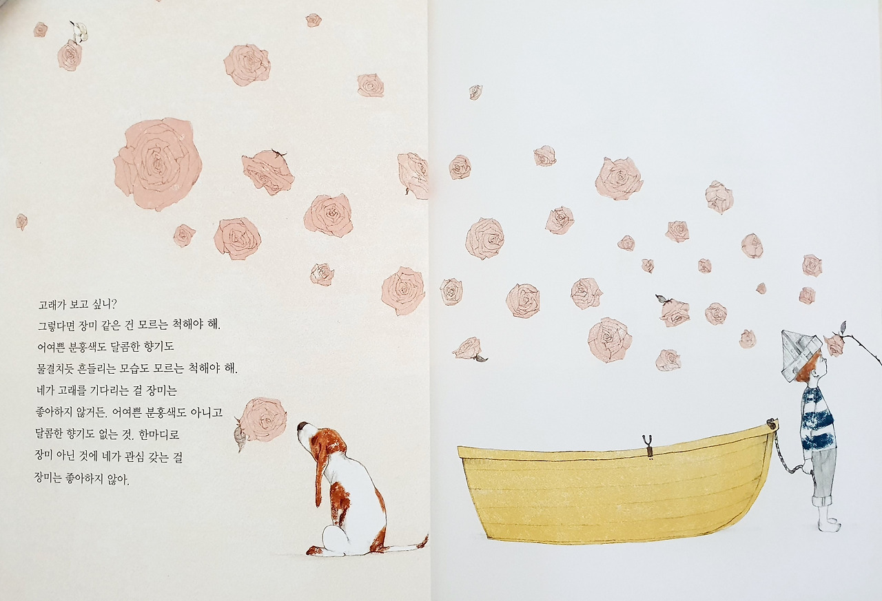 고래를 보고 싶으면 창문과 바다가 있어야 하고 그 앞에서 고래를 기다릴 시간이 필요하다. 고래가 아니라 새였다는 것을 깨달을 시간도 필수다. 달콤한 향기를 뿜는 예쁜 장미도 모르는 척해야 한다. 작은 배에 한 눈을 팔아서도 안 된다. 펠리컨에 마음을 빼앗겨서도 안 되고, 초록색 벌레에게 눈을 돌려도 곤란하다. 고래가 나타날 때까지 한 눈 팔지 않고 기다리고 기다리면 된다.