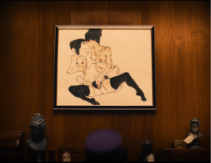 <사과를 든 소년>을 훔치고 그 자리에 걸었던, 에곤 쉴레 작품처럼 보이는 그림 역시 영화를 위해 특별히 제작한 소품인데요. 로드아일랜드스쿨오브디자인(RISD)을 졸업한 리치 펠레그리노(Rich Pellegrino)가 제작했습니다. 감독이 요구한 것은 “두 명의 레즈비언이 자위하는 모습”을 에곤 쉴레 풍으로 그려달라는 것이었어요. 그는 평소 에곤 쉴레의 팬이었기 때문에, 그의 화집을 면밀히 관찰한 뒤 비슷하게 그려낼 수 있었다고 해요. 오스트리아의 화가 에곤 쉴레(Egon Schiele, 1890~1918)는 뛰어난 소묘력으로 격렬한 감정을 잘 표현해낸 작가로 잘 알려져 있어요. 불안한 인간의 신체와 성적인 욕망을 주로 다룬 화가입니다.