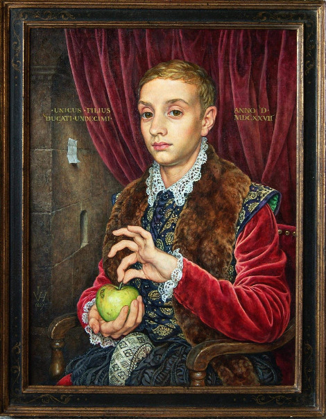 오늘은 구스타브가 마담 D의 집에서 훔쳐서 나오는, 영화 전체에서 핵심적인 역할을 담당하고 있는 작품 <사과를 든 소년(Boy with Apple)>과 이 작품을 대체하기 위해 걸어두었던 또 다른 작품까지, 총 2점에 관해 이야기 나눠볼까 합니다. 이 두 작품은 감독이 의뢰해서 만든 영화의 소품인데요. 이 두 작품이 어떤 레퍼런스를 갖고 있는지 볼게요. 먼저 <사과를 든 소년>은 영국의 화가인 마이클 테일러(Michael Taylor)가 그린 것입니다. 그의 작품은 런던의 국립초상화미술관에도 걸려 있다고 해요. 웨스 앤더슨 감독은 2012년 마이클 테일러에게 찾아가 가상의 르네상스 시기 초상화를 주문했는데요. 그가 레퍼런스로 제시했던 것은 브론치노(Agnolo Bronzino, 1503-1572), 뒤러(Durers, 1471-1528), 튜더(Tudor) 초상화 였다고 해요. 이 세 가지 샘플은 각각 다 다르지만, 감독은 그 속에 있는 요소들을 모두 결합한, 존재하지 않는 어떤 것을 만들어낼 것을 요구했어요. 감독이 설정한 르네상스 거장의 이름은 요하네스 반 호이틀(Johannes Van Hoytl, 1613-1669), 에드 먼로(Ed Munro)라는 연극학교 학생을 모델로 삼았어요.