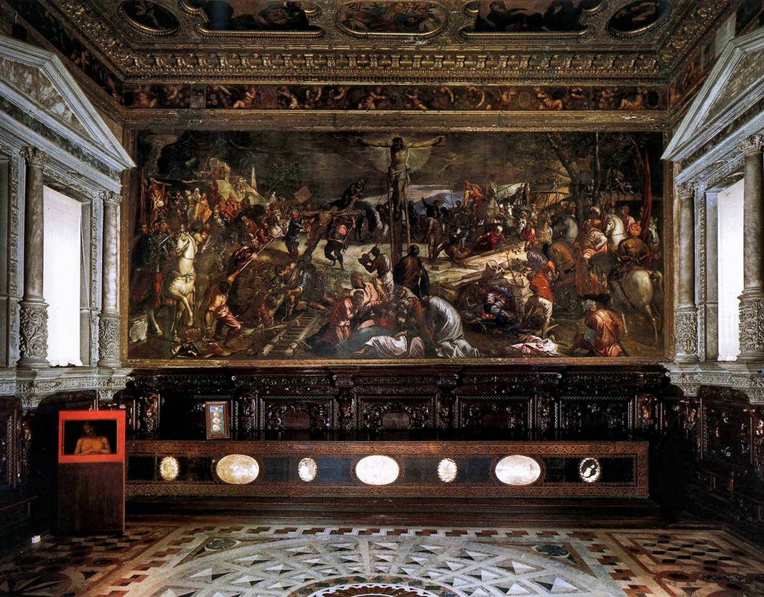 틴토레토(Tintoretto, 1519~1594)의 본명은 야코포 로부스티(Jacopo Robusti)입니다. 별칭 틴토레토는 그의 아버지의 직업인 염색공(틴토레, tintore)에서 가져온 것으로, 어린 염색공 이라는 뜻이랍니다. 그는 자신의 출신 배경을 숨기기보다는 당당하게 밝히는 쪽에 더 가까웠어요. 오늘 소개드릴 작품 <그리스도의 십자가 처형>은 스쿠올라 그란데 디 산 로코(Scuola Grande di San Rocco, Venice)에 원래 상태 그대로 아직까지도 보존되어 있어요. 스쿠올라는 13세기 시작된 베네치아 특유의 문화예요. 스쿠올라 그란데 디 산 로코는 1478년 창설된 성 로코를 수호 성인으로 하는 조직으로, 수호 성인과 관련된 미술작품으로 회관을 장식해 주요한 미술 후원자가 되었어요. 신앙심이 깊은 평민들로 구성된 스쿠올라는 군주나 귀족과는 다른 취향의 미술 작품이 있도록 했어요.