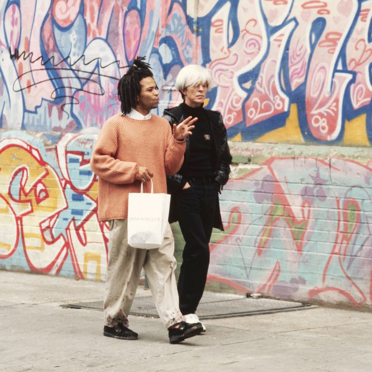 그는 친구 알 디아즈와 함께 ‘세이모(SAMO, SAme Old Shit)’라는 이름으로 뉴욕의 길거리에 그래피티를 했어요. 길에 서서 사람들에게 자기가 하고픈 말을 계속 할 수는 없으니 벽에 낙서를 했다고 해요. 바스키아는 더 유명해지길 원했지만, 디아즈는 익명의 화가로 남길 원해 세이모는 해체하게 되어요. 갤러리에서 전기공사를 돕는 아르바이트를 하기도 했던 바스키아는 더 많은 사람들에게 자신의 작품을 보여주고, 또 유명세를 얻고 싶어해요. 어느 날 우연한 기회에 앤디 워홀(Andy Warhol, 1928~1987)과 갤러리스트 브루노 비쇼프베르거(Bruno Bischofberger, 1940~)가 식당에 들어가는 것을 발견하고 따라 들어가요. 그곳에서 앤디 워홀에게 자신이 그린 작은 그림들을 팔았고, 앤디 워홀은 그의 재능을 알아보게 됩니다. 한 파티에서 만난 르네 리카드(Rene Ricard, 1946~2014)는 바스키아의 그림을 보자마자 그의 천재성을 알아봐 주었어요. 디에고 고르테즈(Diego Cortez)가 기획한 <New York/New Wave>(1981)전은 P.S.1에서 열렸는데요. 이 전시를 통해 바스키아는 갤러리스트인 아니나 노세이(Annina Nosei), 헨리 게르트잘러(Henry Geldzahler, 1935~1994) 등을 만나게 돼요.