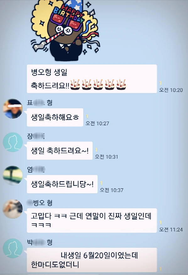 누군가의 생일이 되면 흔히 볼 수 있는 장면이다. 앱의 알람이 친구의 생일 소식을 알리면 톡방의 누군가가 대표로 생일축하 메세지를 보냄으로써 나머지 멤버들이 알게 되고, 결국 모두가 축하 메세지를 전달하는 아름다운(?) 상황이 연출된다.