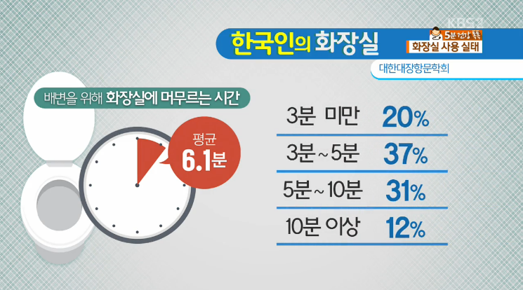스마트폰을 갖고 화장실에 가면 배변시간이 최소 10분이상 길어진다.