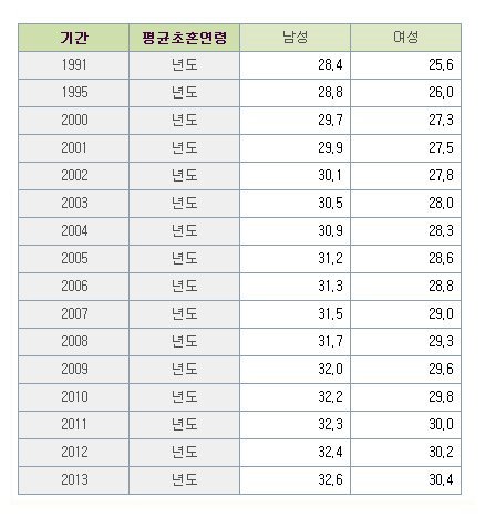 2016년 결혼정보회사 설문조사에 의하면 남자 26.1세, 여자 27.8세라고 답했으며, 실제는 남자 30.2세, 여자 32.3세로 집계됐다고 한다.