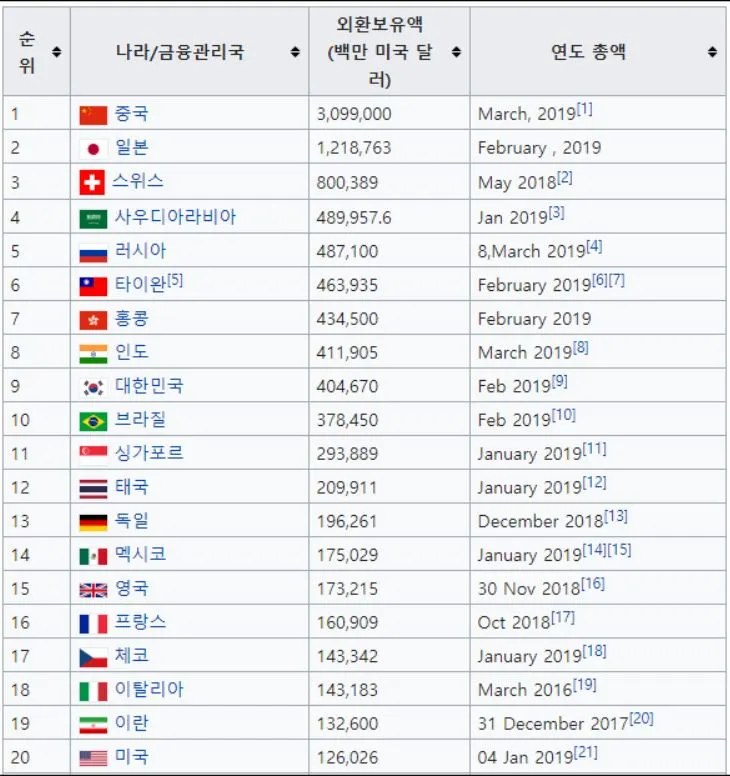 2019년 기준 국가별 외환보유고 <출처 : 연합뉴스>