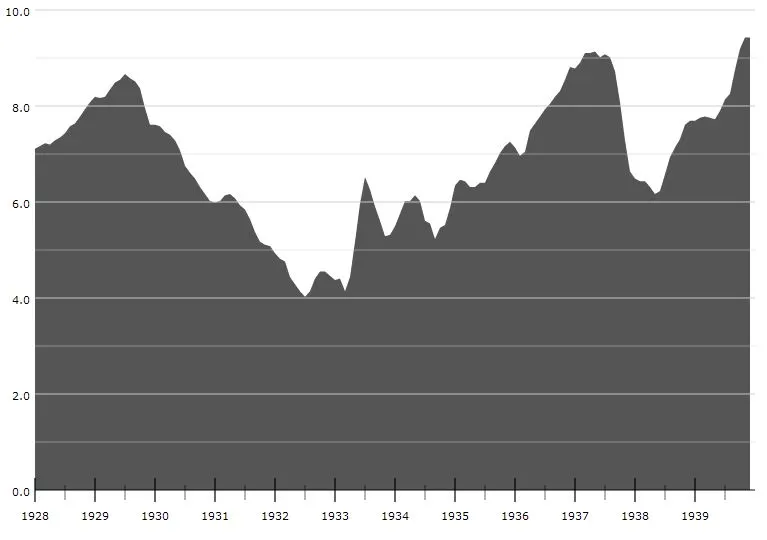 추락한 미국의 산업지수 모습 (1928~40) <출처 : 위키피디아>
