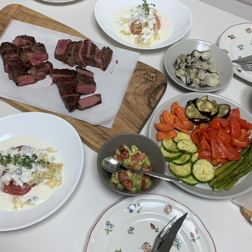 소고기를 굽고, 단맛을 머금은 채소를 오븐에 굽고, 양배추를 볶아 연어를 감싸고 요거트 소스를 붓고, 잘 익은 아보카도에 토마토를 썰어 넣어 과카몰리를 만들었다.