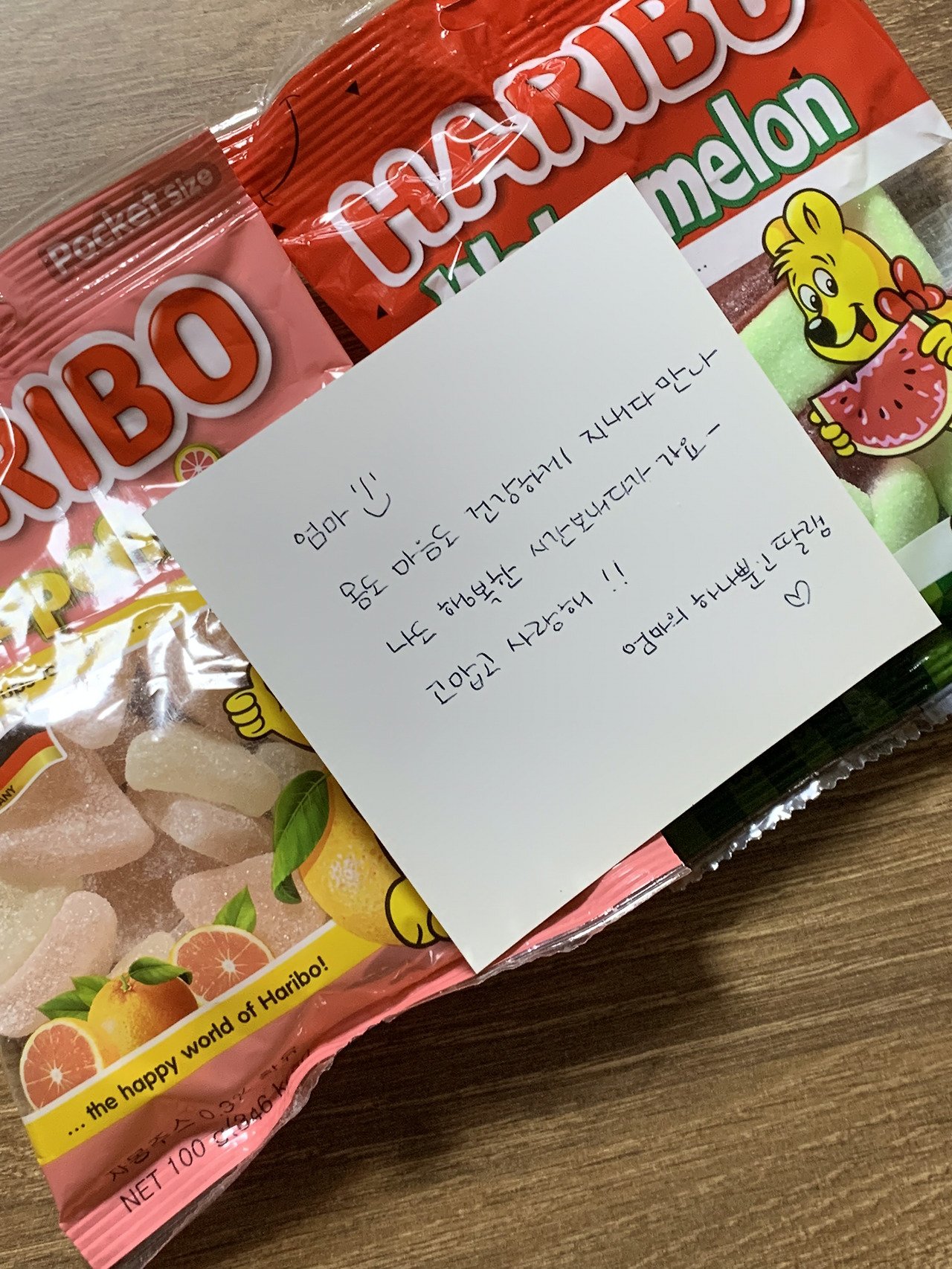 엄마는 귀엽게도 젤리를 좋아해서 예전부터 나는 집에 들어갈 때면 한 봉지씩 사갔었다. 그럼 엄마는 그걸 비타민 마냥 조금씩 나누어먹었다. 이번에도 운동을 끝내고 집으로 돌아가는 길에 편의점에서 젤리 두 봉지를 샀다. 그리고 짧은 쪽지와 함께 올려두고 나왔다.