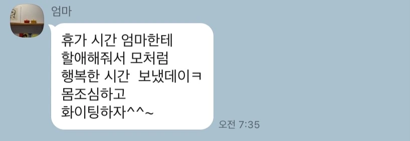 엄마가 집에 오면 일정이 어떻게 되냐고 물었을 때, 아무 일정 없어~ 집에만 있을 거야. 엄마랑만 있을 거야. 하고 말했을 때 엄마는 그러라고 했다. 어차피 서울에서 온 사람 여기저기 돌아다니면 안 된다고. 시간도 짧게 왔지만 그냥 이번에는 그러고 싶었다. 그리고 정말 엄마랑만 있었다.