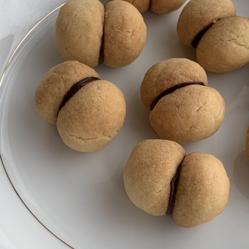 이탈리아 쿠키, 바치디다마를 구웠다. 재료는 간단하다. 박력분, 아몬드 파우더나 헤이즐넛 파우더, 슈가파우더, 버터를 넣어 쿠키를 먼저 구운 뒤에 녹인 다크 초콜릿으로 샌드한다.