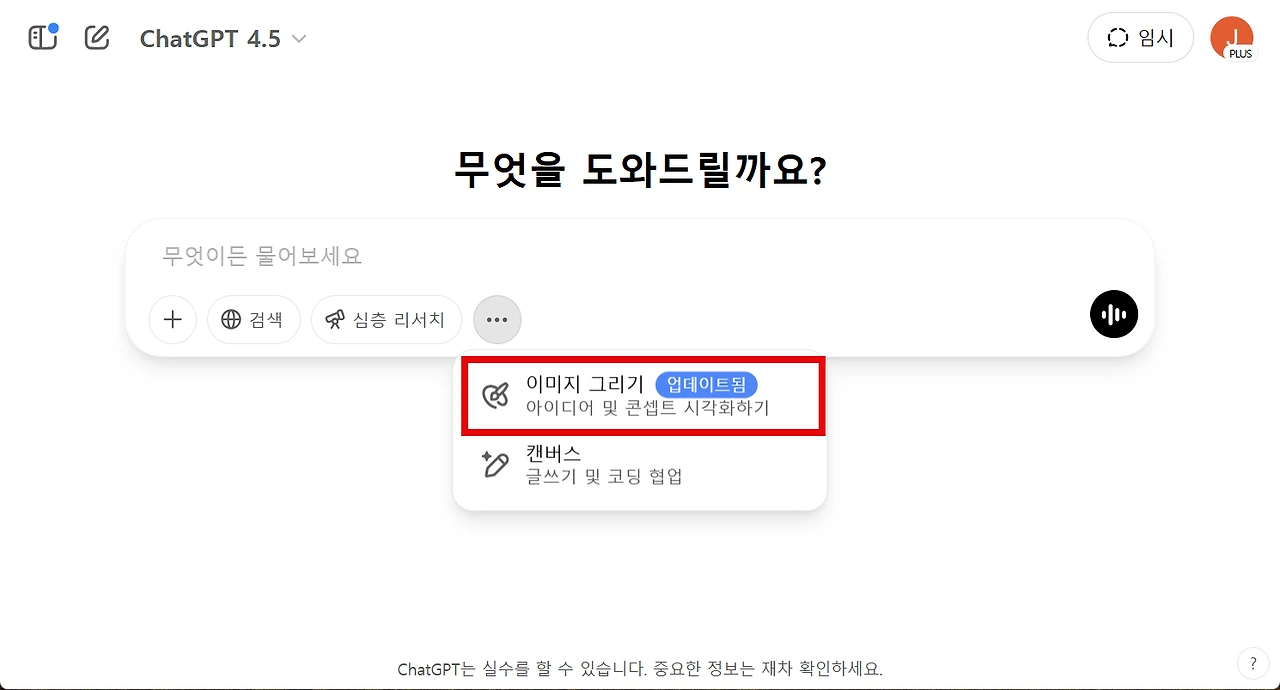 이미지 생성 옵션 선택: 채팅 입력창 옆의 세 개의 점 아이콘을 클릭하면 'Image'와 'Canvas' 옵션이 나타납니다. 여기서 '이미지 그리기'를 선택합니다.