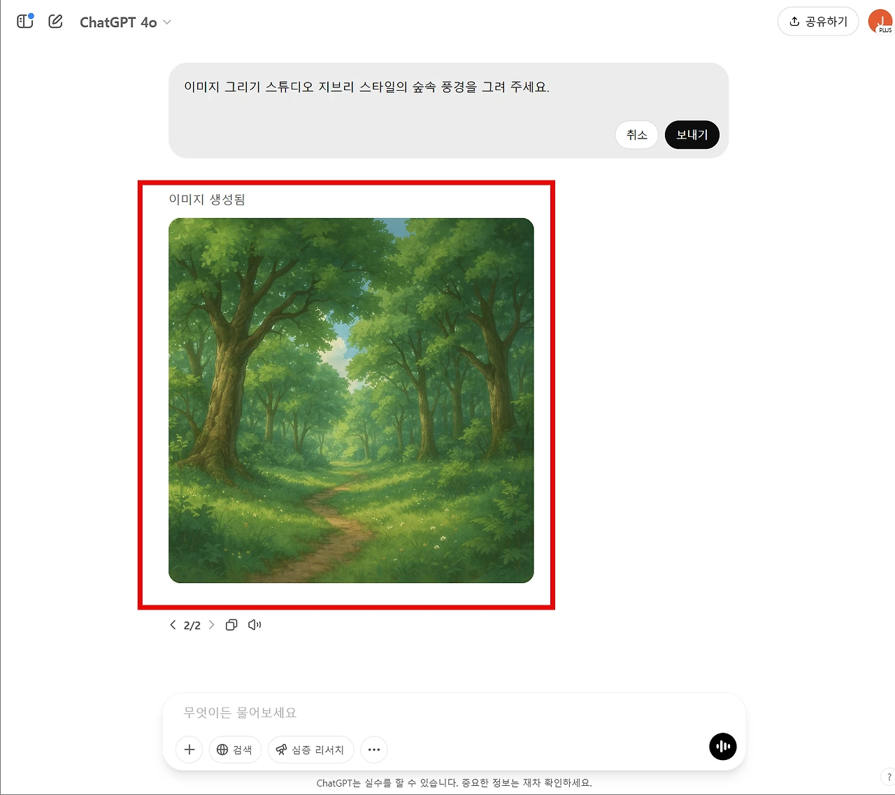 프롬프트 입력: 원하는 이미지에 대한 설명을 입력합니다. 예를 들어, "스튜디오 지브리 스타일의 숲속 풍경을 그려 주세요."와 같이 구체적으로 요청할 수 있습니다. (입력한 프롬프트의 복잡성에 따라 이미지 생성에는 최대 1분 정도 소요될 수 있습니다.)