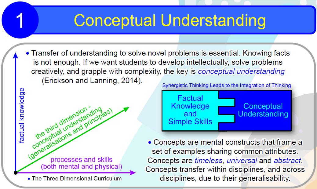 새로운 문제를 해결하기 위한 이해의 전이는 필수적입니다. 단순히 사실을 아는 것만으로는 충분하지 않습니다. 학생들이 지적으로 발전하고, 창의적으로 문제를 해결하며, 복잡성을 다룰 수 있도록 하려면, 개념적 이해가 핵심입니다.(Erickson and Lanning, 2014)