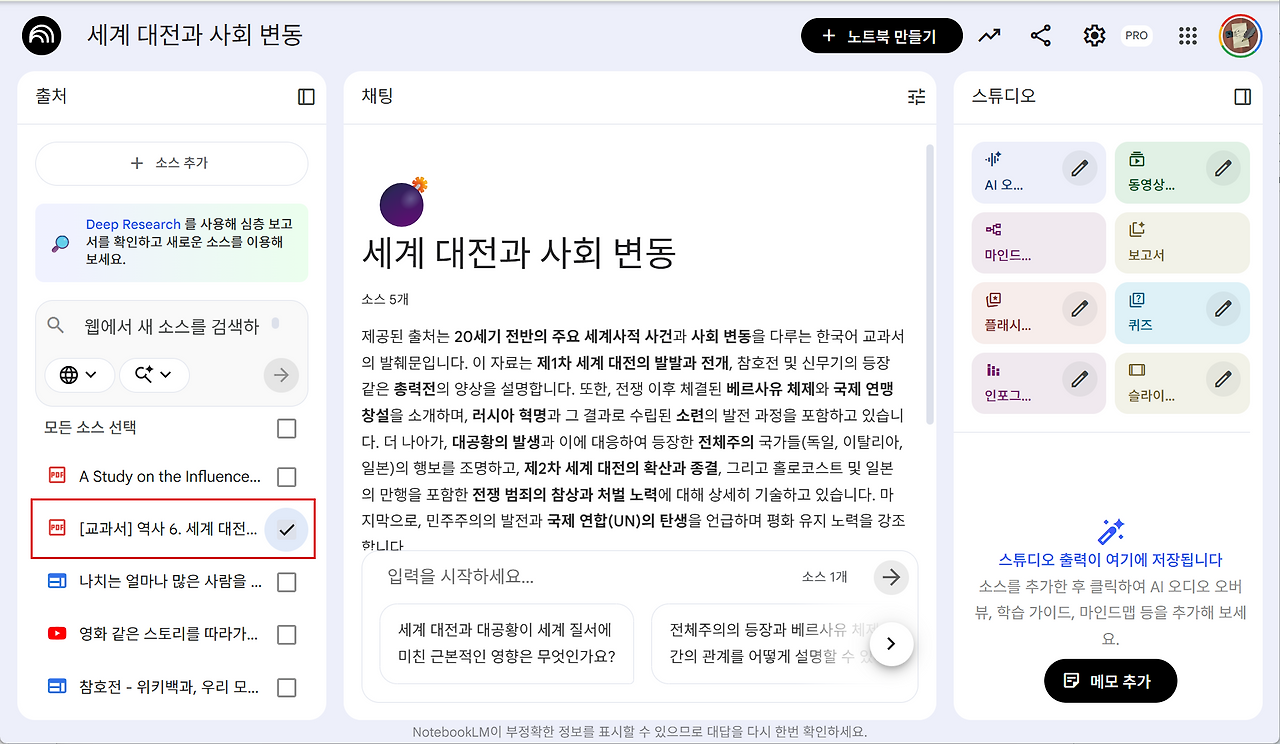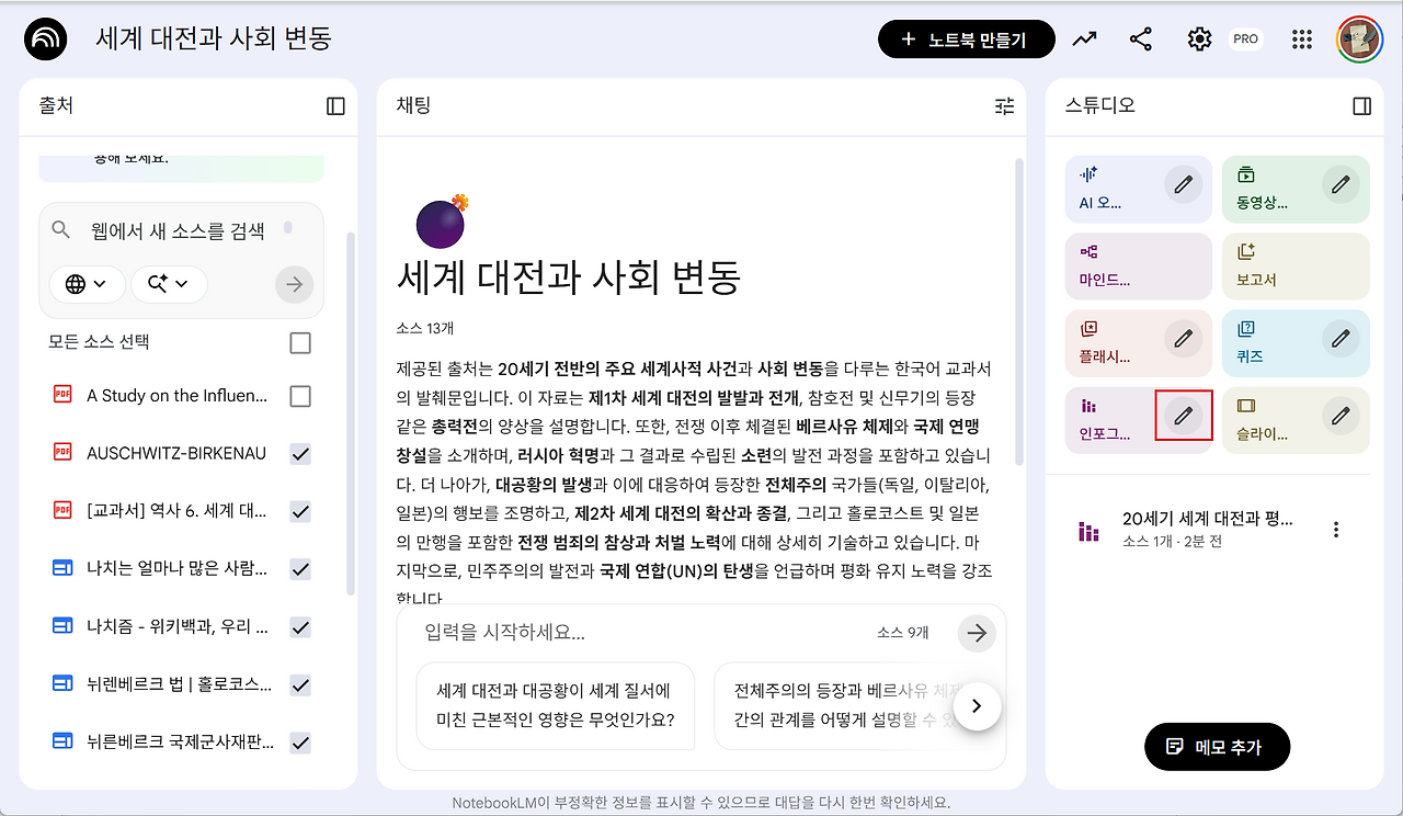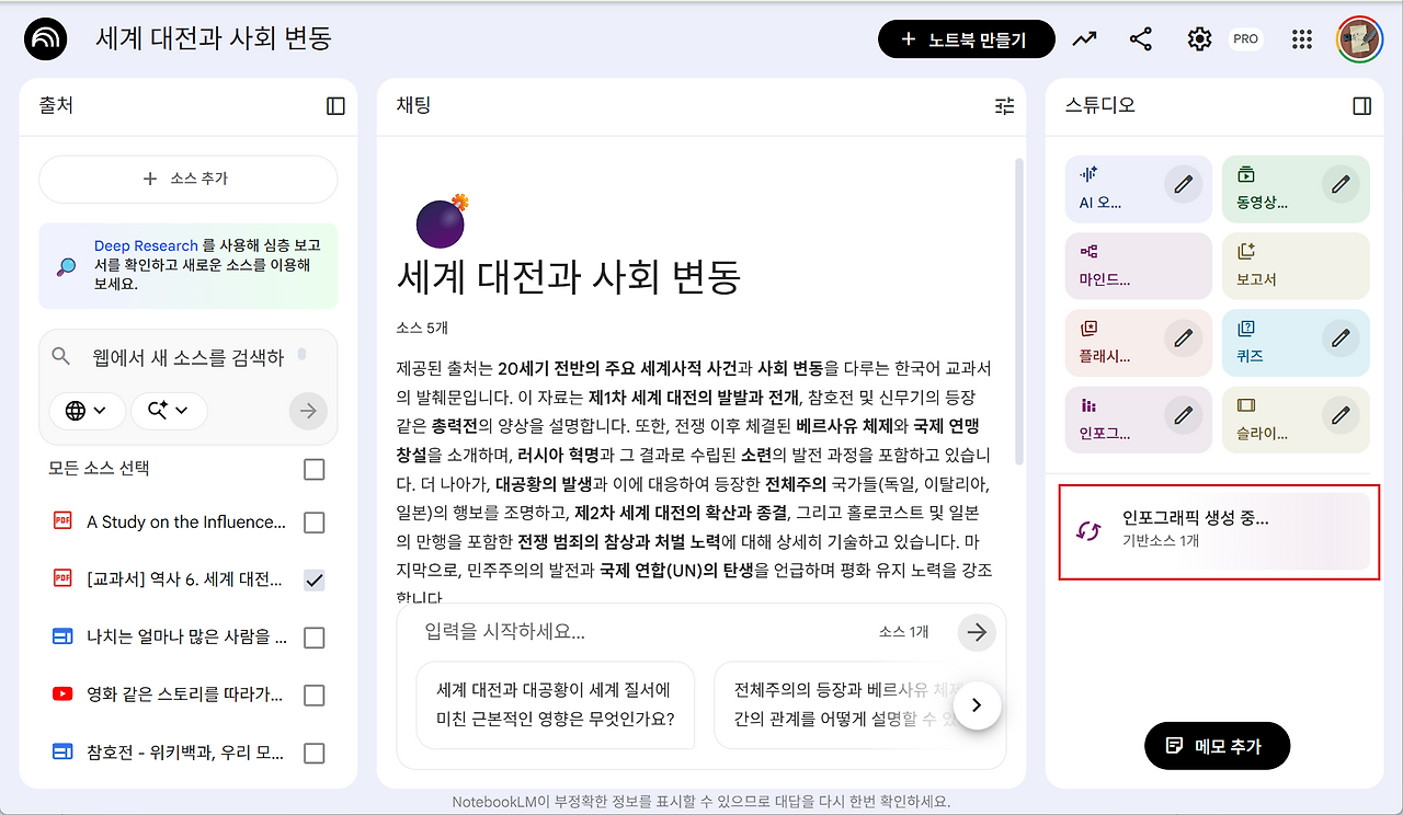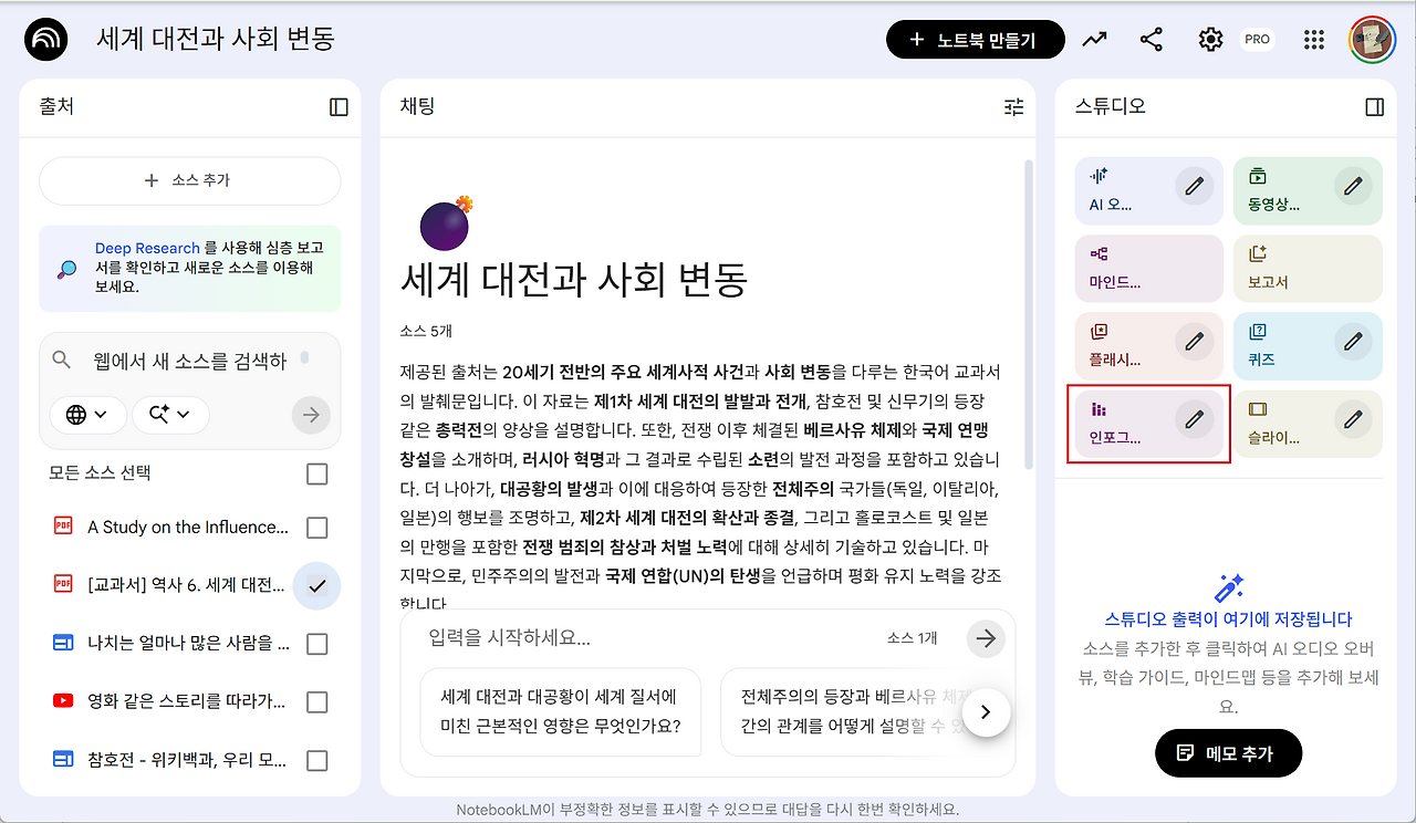 중학교 역사 교과서 '세계 대전과 사회 변동' 부분을 소스 자료에 업로드합니다. 자료를 선택한 후 인포그래픽을 클릭합니다.