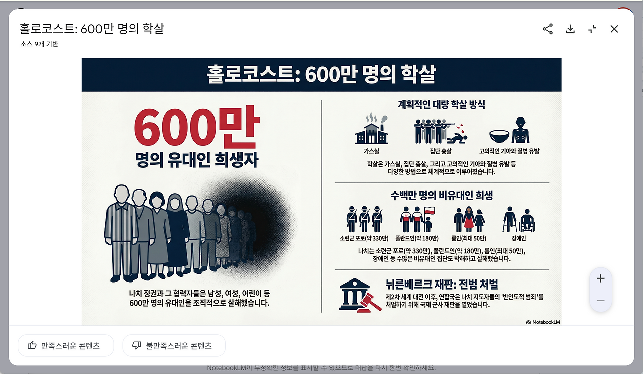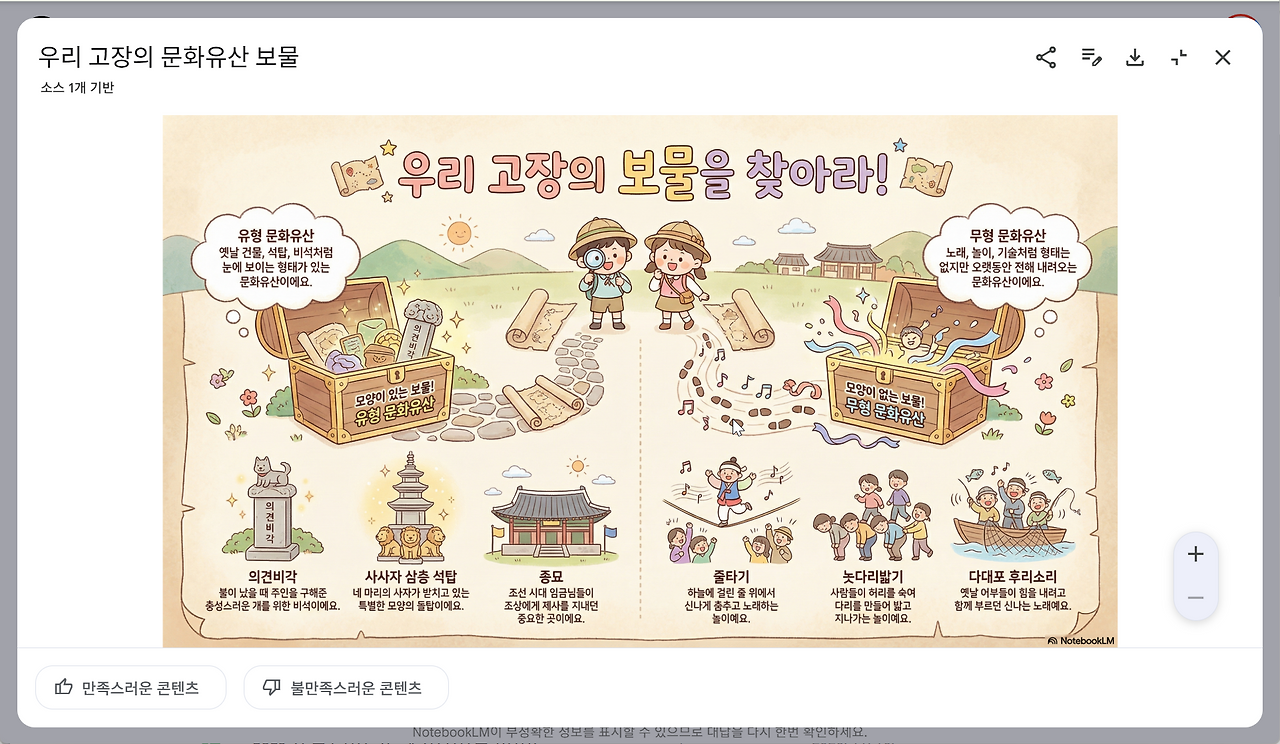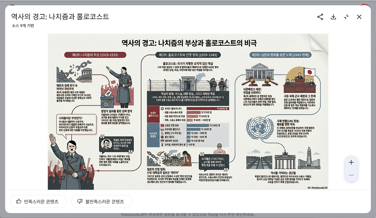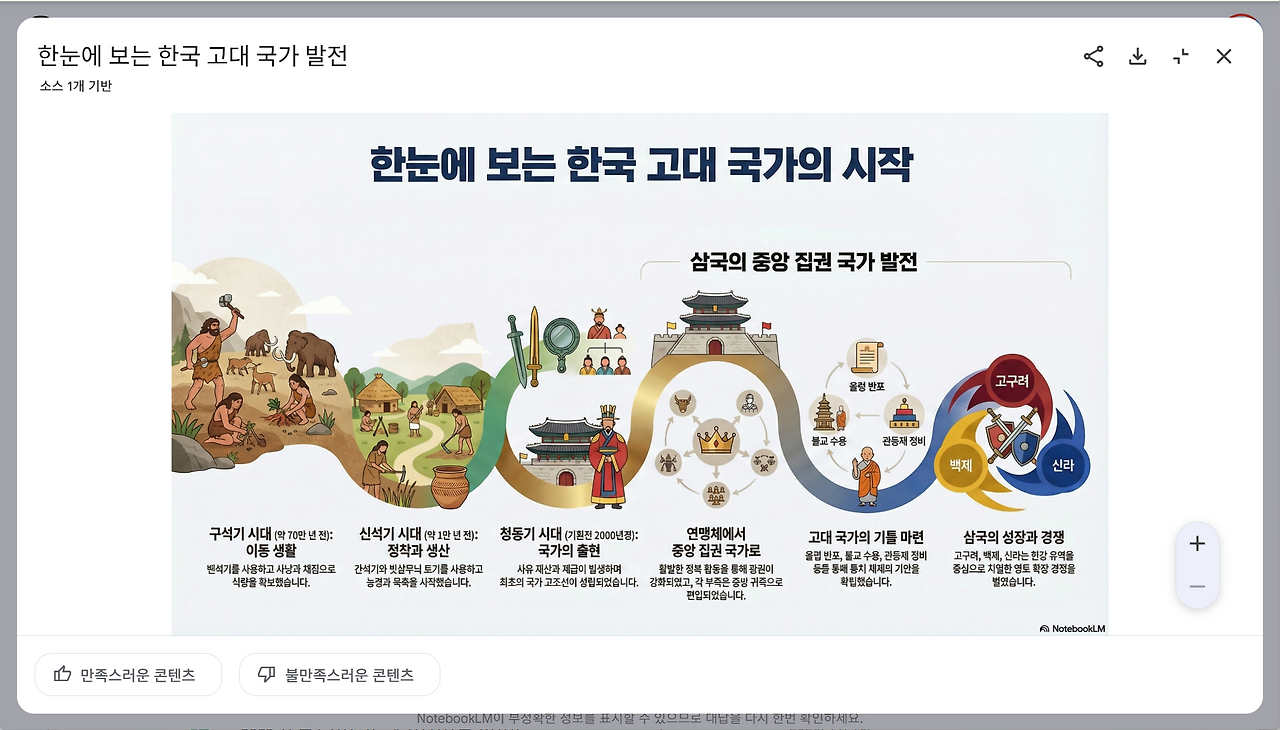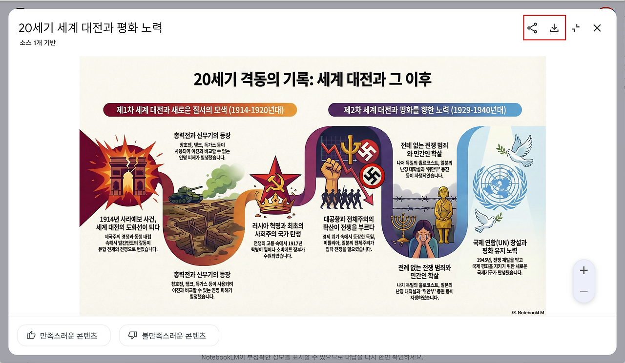 생성이 완료되면 스튜디오 패널에 완성된 인포그래픽 이미지가 나타납니다. 이미지를 클릭하면 확대해서 내용을 자세히 살펴볼 수 있습니다. 결과물이 마음에 든다면 이미지 우측 상단의 메뉴로 링크를 공유하거나 이미지 파일을 내 컴퓨터에 저장합니다.