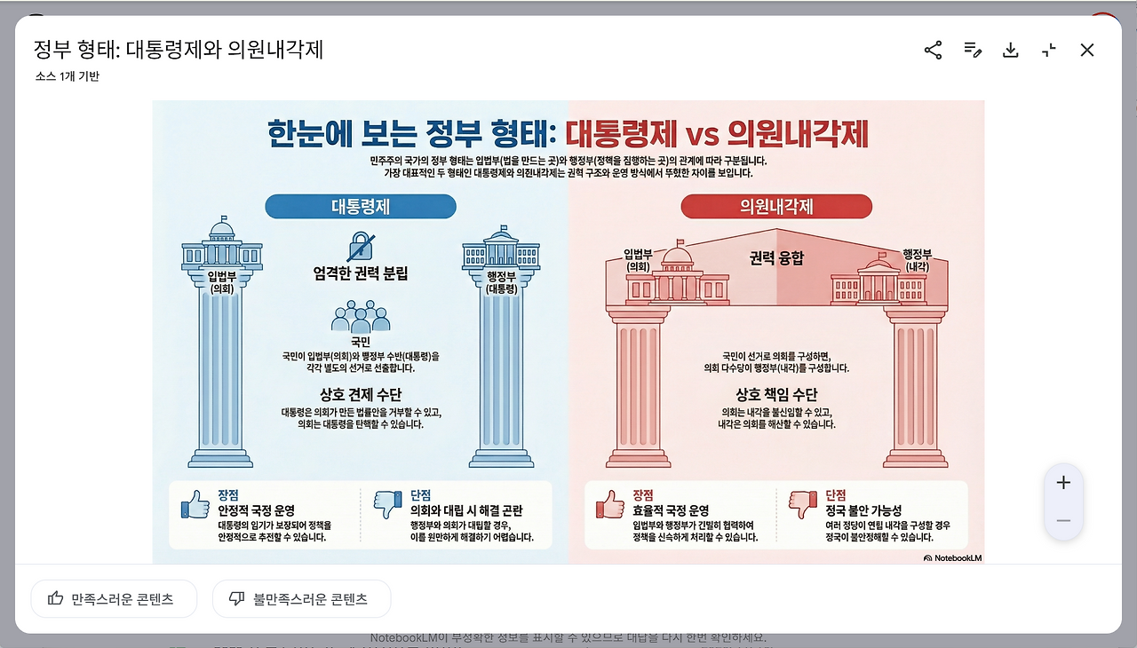 "대통령제와 의원내각제의 차이점을 비교하려고 합니다. 화면을 좌우로 분할해서 두 제도의 특징이 대조적으로 보이게 해 주세요. 한쪽은 파란색, 다른 쪽은 붉은색 계열을 써서 시각적으로 확연히 구분되게 만들어 주세요."