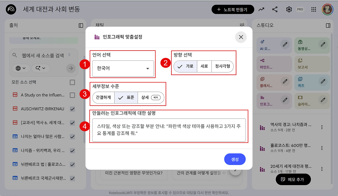 가장 먼저 시각화할 재료를 준비해야 합니다. 기존 노트북을 열거나 새 노트북을 만듭니다. 화면 왼쪽의 [소스 추가] 버튼을 눌러 수업 강의 요강, 논문 PDF, 혹은 역사 다큐멘터리 유튜브 링크 등을 업로드합니다. 업로드된 소스 목록에서 인포그래픽 생성에 반영할 자료 옆의 체크박스를 선택합니다. (여러 개를 동시에 선택하여 통합 인포그래픽을 만들 수도 있습니다.)