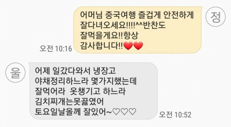 미국에서 석사 어드미션을 받았을 때 울 어머님은 니엘이는 엄마가 봐줄 거니까 걱정하지 말고 공부하라고 그 누구보다 적극적으로 지원해주셨다. 그래서 한국에 잠깐 들어갔다가 다시 미국으로 돌아갈 예정이었는데 갑자기 아버님이 쓰려지시고 연이어 어머님도 쓰러지셔서 미국에 갈 수 없는 상황이 됐다. 그 부분을 매번 말씀하시며 미안해하신다. 그때 정말 우리 가족은 너무 힘들었다. 우리가 서로 도우며 이해하며 살지 않았으면 이 힘든 상황을 이겨내지 못했을 거다.그리고 울 어머님은 매년 양력도 아니고 음력 생일을 잊지 않고 챙겨주신다. 생일 문자도 이렇게 보내주신다.