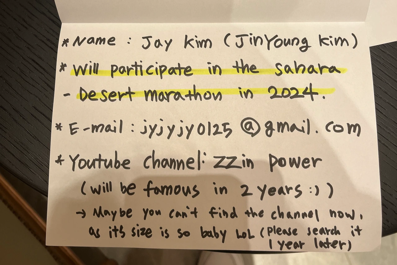 (원래 기존에 다니던 회사 명함을 줄까했는데 하필 이 날 못챙겨왔다. 그래서 못생긴 손글씨로 만들었다.)