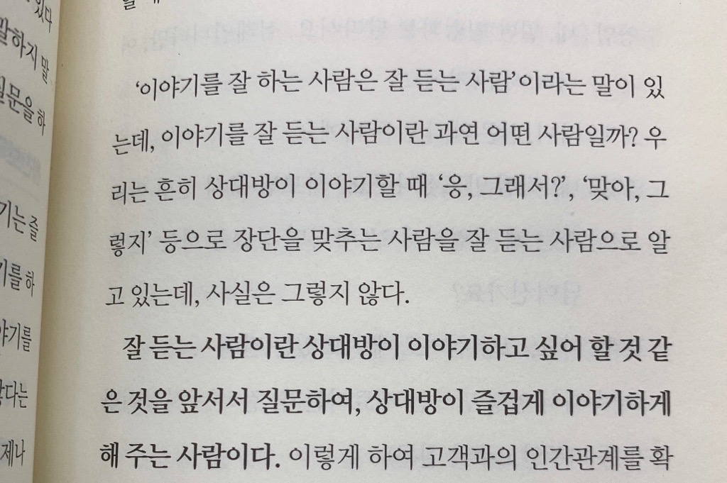 “잘 듣는 사람이란 상대방이 이야기하고 싶어할 것 같은 것을 앞서서 질문하여, 상대방이 즐겁게 이야기하게 해주는 사람이다.