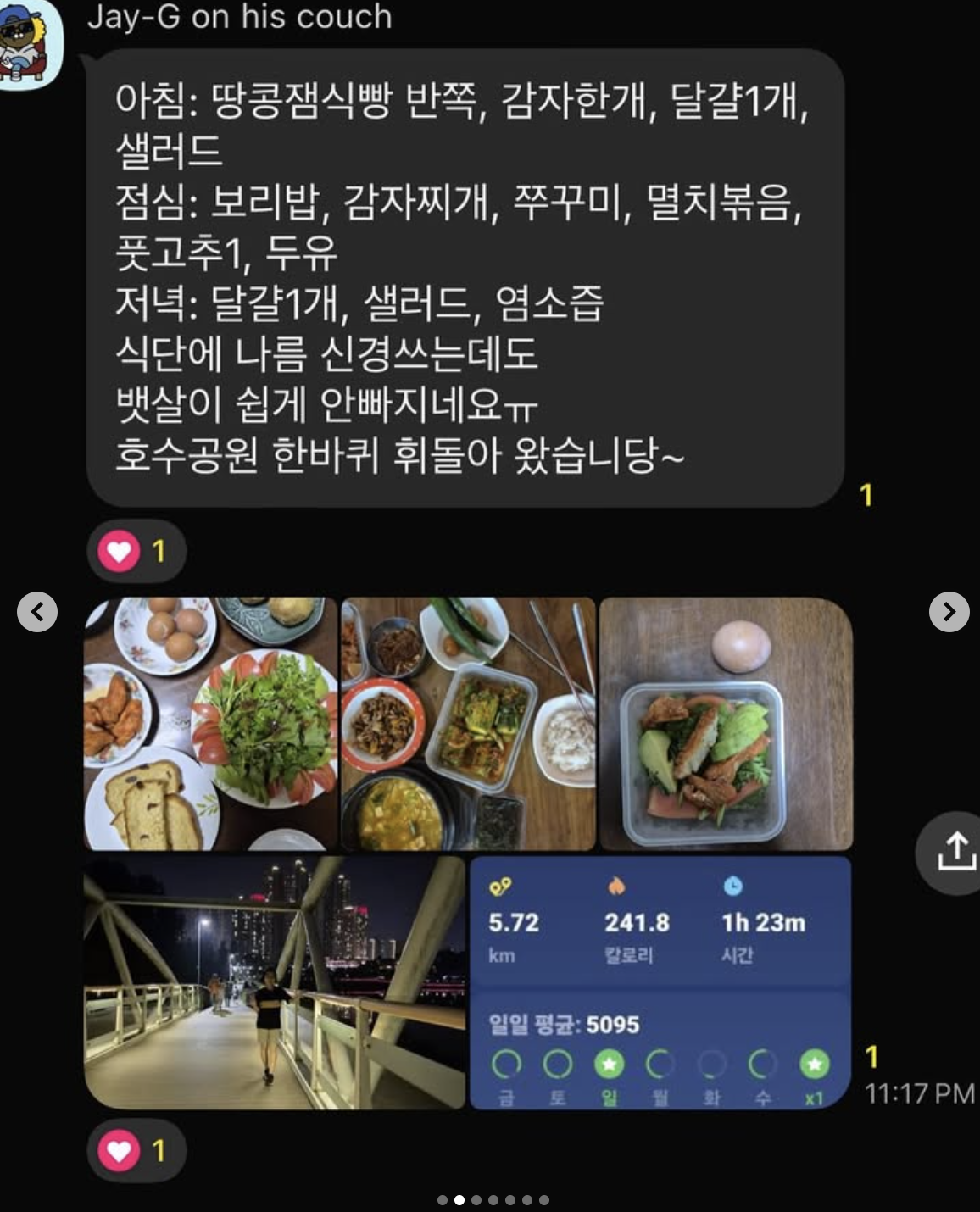 무엇보다 서로의 식단, 운동 현황을 톡방에서 살펴볼 수 있었기에 평소에 몰랐던 엄마의 활동들을 적극적으로 알 수 있었다. 평소에는 주 1회 정도 통화를 하면서 안부를 나누는 격이었는데, 톡방을 운영하면서 매일 서로 뭘 먹었고 무슨 운동을 했는지 알 수 있었던 점이 좋았다.