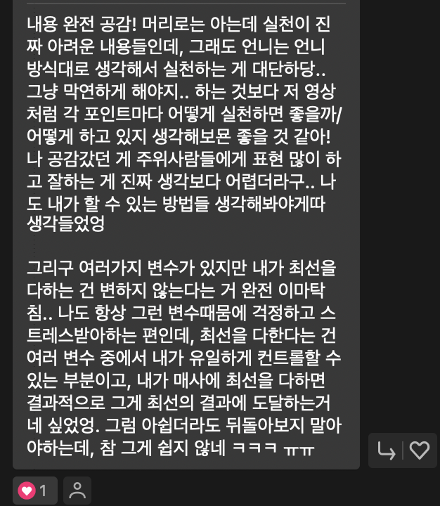 이번 영상이 한 사람이에게라도 공감이 되었으면 좋겠다는 생각을 했었는데 친구의 말을 듣고 감격스러웠다.