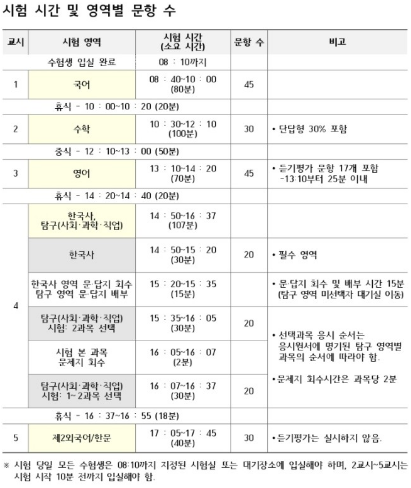 8시 10분까지 입실하고 8시 40분부터 국어 시험이 시작된다.