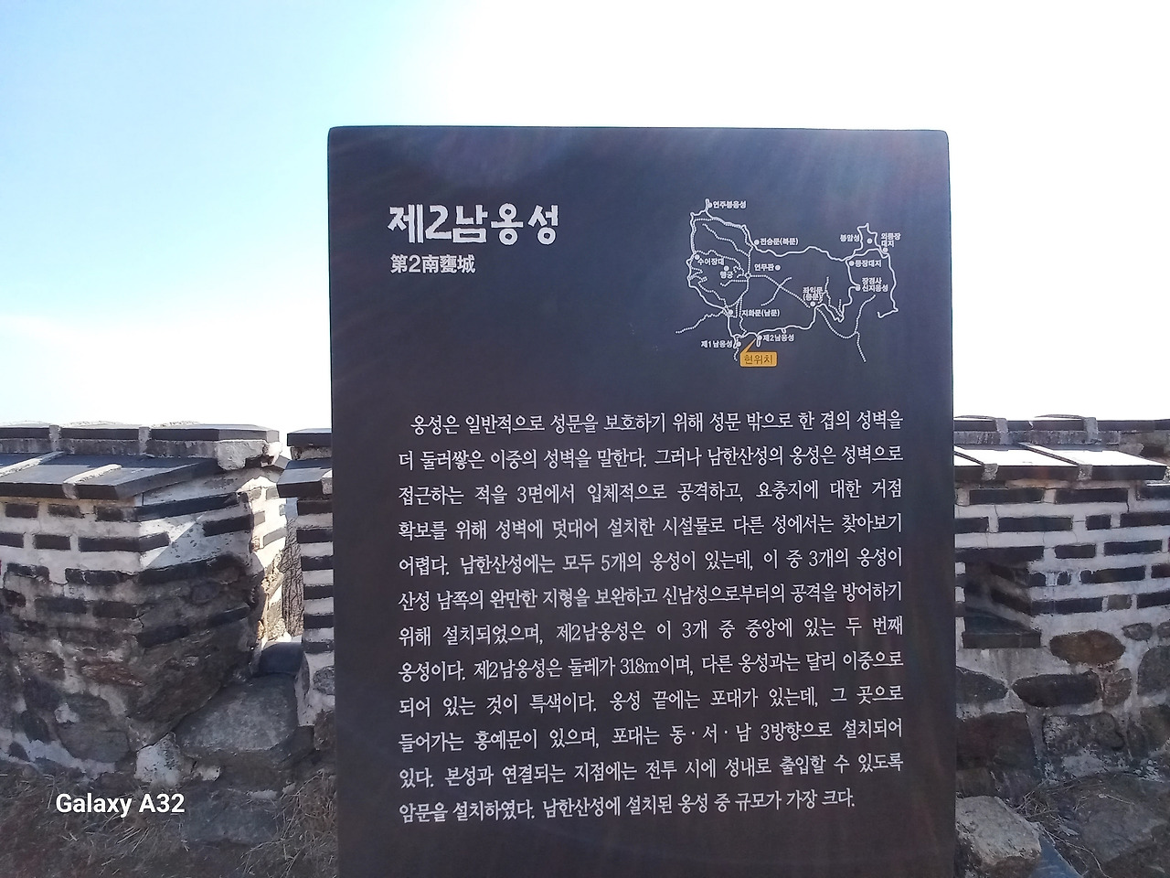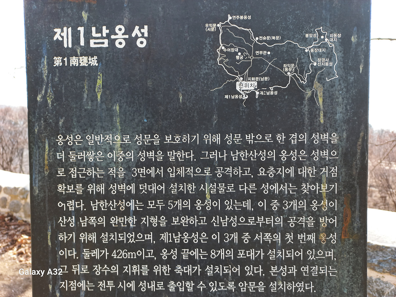 작년(2022.07.22, 남한산성 탐방 글)에 친구와 남문(지화문) 기준으로 시계방향으로 내성을 한 바퀴 순회했다. 서로 간 밀린 이야깃거리에 집중하느라 성곽을 자세하게 보지 못한 것 같았다. 특히 5개의 옹성과 외성인 벌봉의 봉암성을 자세히 보지 못하였다. 그래서 오늘(2023.03.18. 토. 흐림)은 남한산성 남문을 기준으로 시계 반대 방향으로 옹성과 외성의 상황을 살펴보기로 하였다. 동일한 사물도 보는 방향에 따라 달리 보이는 법이다. 동일한 코스인데 등산할 때의 길과 하산할 때의 길이 생소하여 보인다. 오늘의 내성 성곽 길도 역시 많이 달라 보였다.