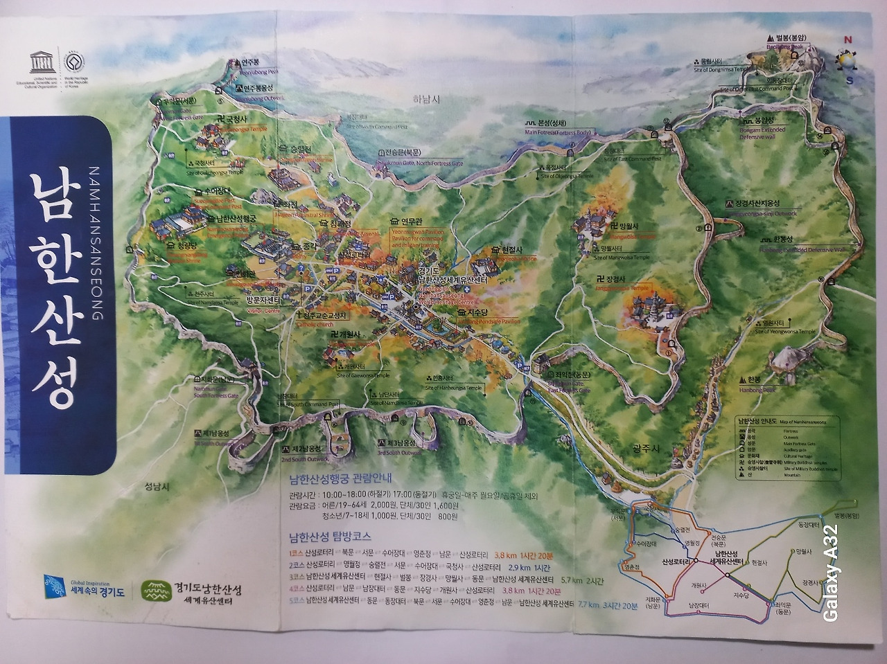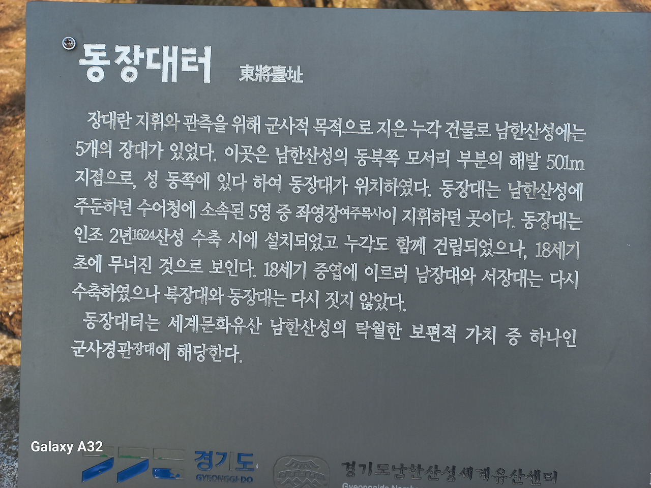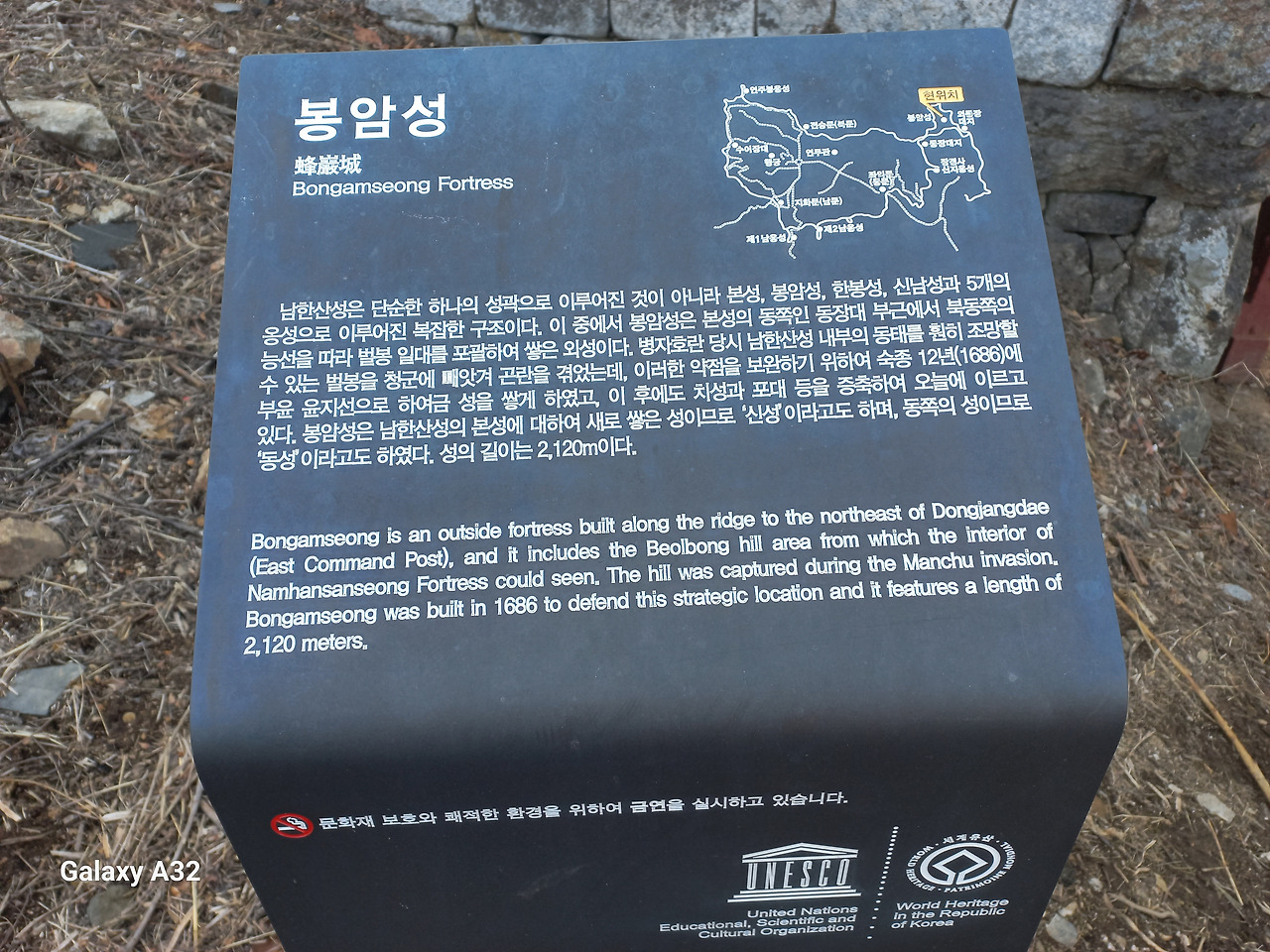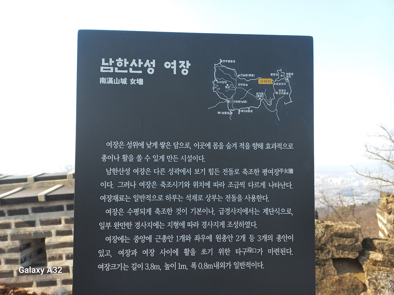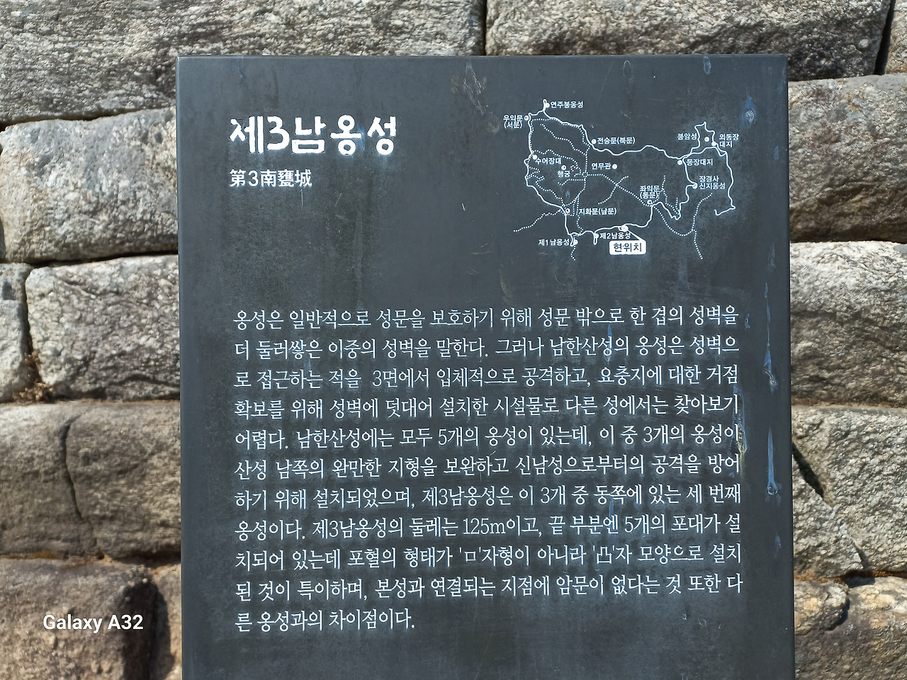 남한산성은 본성과 외성으로 나누어진다. 외성(벌봉 봉암성)은 병자호란 이후 쌓았다고 한다. 내성 전체 한 바퀴 거리는 약 7.7km 3시간 20분 거리(제5 코스, 내성 기준, 안내표지판)이라고 안내 표지판에 기재되어 있다. 옹성에 내려가 둘러보는 시간이 더 필요하여 약 7시간 소요되었다. 약 3만 보 걸음이다.