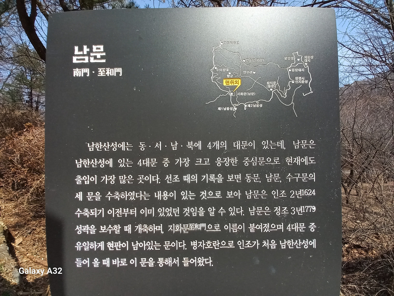 남문은 가장 크고 웅장하다. 현판에 지화문이라고 세겨져 있다. 인조가 청의 군사에 밀려 처음 들어온 문이다.