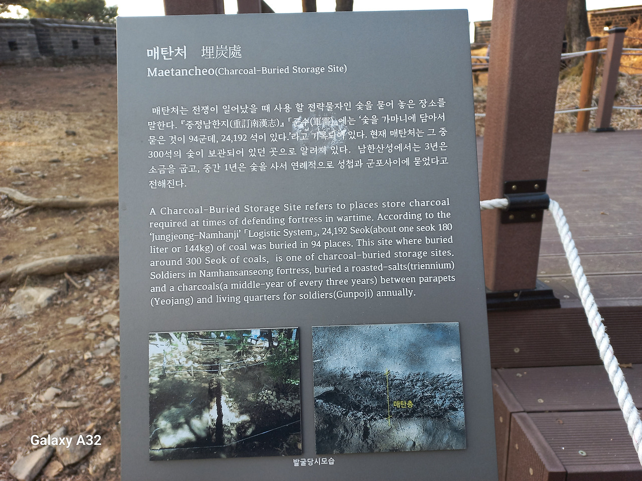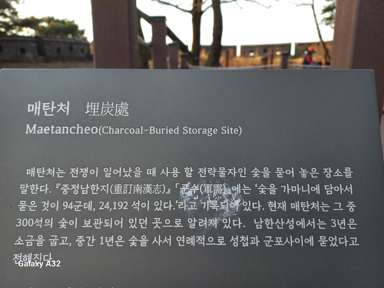 매탄처 (埋炭處) : 숯을 묻어 놓은 곳이다. 전쟁이 일어났을 때 사용하기 위해서 묻었다. (94군데, 24,192석)