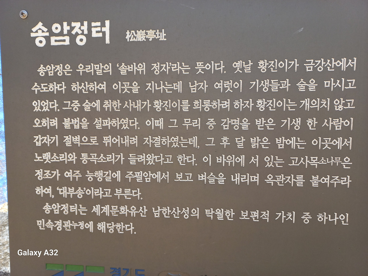 솔바위 정자 터다. 전설이 적혀 있다. 옛날 황진이가 금강산에서 수도하다 하산하여 이곳을 지나가는데 남자 여럿이 기생들과 술을 마시고 있었다. 술에 취한 한 사내가 황진이를 희롱하려 하자 황진이는 오히려 불법을 설파하였다. 그때 기생 중 한 사람이 갑자기 절벽에서 뛰어내려 자결하였다. 그 후 밝은 밤에는 노랫소리와 통곡소리가 들려왔다고 한다. 바위에 서 있는 소나무 고사목에 정조가 여주 능행길에 주필암에서 보고 벼슬을 내리며 옥관자를 붙여주라고 하여 ‘대부송’이라고 불렀다고 한다.