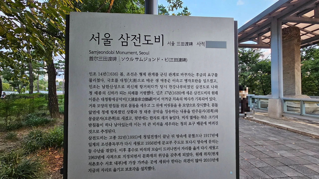 (삼전도비는 2024.09.28일 필자가 백제 위례성 탐방 시 몽촌토성과 풍납토성을 방문 후, 석촌고분군으로 이동할 때 처음으로 찾아가 보았다. 한성 백제 박물관 탐방 관련글에 이미 발표한 내용과 사진 ***~***부분을 재인용한다)