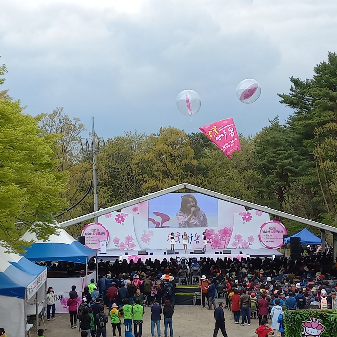 하산은 소형 셔틀버스 탑승대신에 두 발로 하였다. 내려오면서 잠시 2개의 개막 축하 공연을 보았다. 하나는 풋풋한 젊은 두 청년의 패기 넘치는 산속 길거리 공연(반딧불이 버스킹)이었다. 숲 속 휴양림 넓은 장소에서 개막축하공연이 진행되고 있었다. 가수 박미경의 트롯풍의 노래에 관객들이 격렬하게 환호를 하고 있었다. 주최 측에서 많은 준비를 하였으나 날씨(흐림/비)와 일기 변화로 정상의 진달래가 냉해를 입었다는 뉴스에 등산객이 아쉽게도 목표보다 다소 감소한 것 같았다.