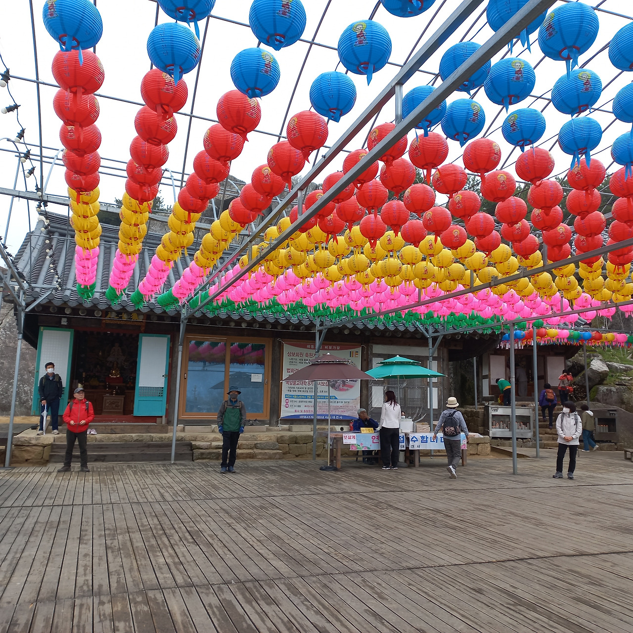 진달래와의 첫 만남 후에 바로 인접한 대견사와 연결된 계단을 타고 내려왔다. 벼랑 끝머리에 아슬아슬하게 선 부처바위가 부처님 설법을 설파하는 듯 장엄하게 서 있었다. 대견사의 심벌이다. 암반 끝에 세워진 삼층석탑이 오랜 세월을 굿굿하게 버티며 서있다. 행사 요원들이 벼랑끝 쪽으로 가지 말라고 주의를 주고 있었다. 그래도 어디에서나 인생 사진을 찍는 용감한 탐방객이 있다. 위험 테이프가 진입을 막고 있었다.