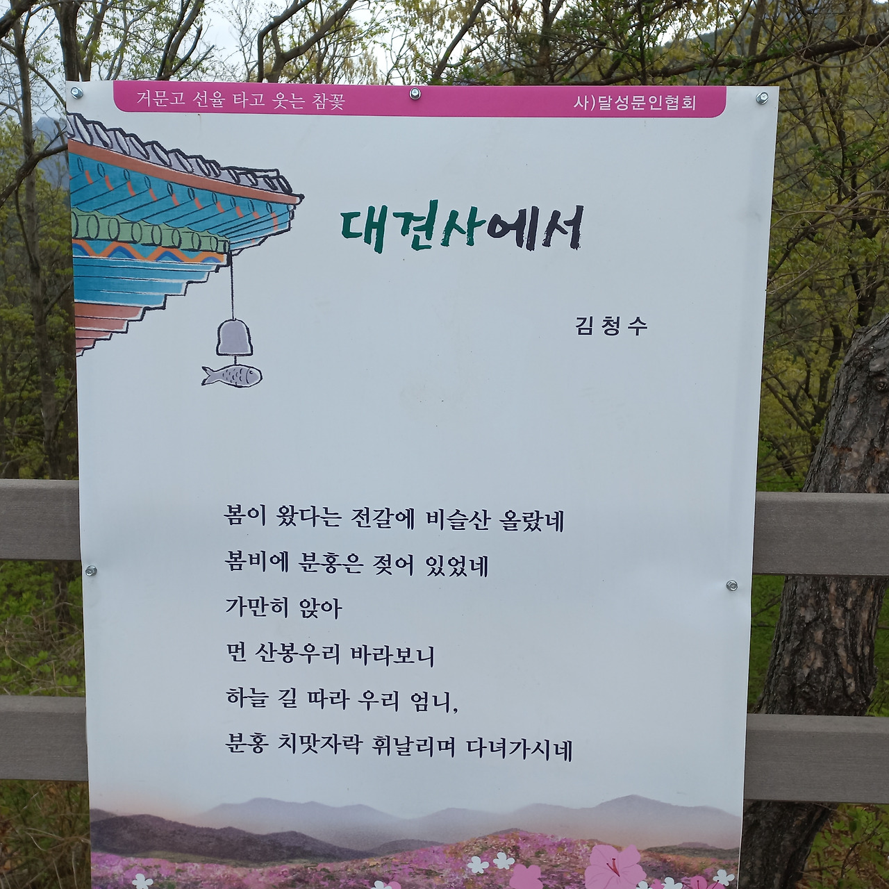 대견사는 ‘크게 보고’, ‘크게 느끼고’, ‘크게 깨우친다’라는 뜻이다. ‘北봉정, 南대견’이라고도 불린다고. 설악산 봉정암과 함께 하늘 아래 가장 높은 도량이라는 뜻이다. 고려 말에 몽골 침입으로 폐허가 됐다가 1371년 다시 지었다. 그런데 한일합방 후 비슬산 산세와 대견사가 대마도를 당기고, 일본의 기를 꺾는다는 속설 때문에 1917년 6월 23일 강제로 폐사됐었다고 한다. 이후 약 100여 년간 폐사지로 방치됐다. 조계종 동화사와 달성군 노력으로 2014년 복원되었다고 한다. 참꽃 문화제 주관처에서 시집을 배부하고, 보도옆에 걸개그림으로 걸어 두었다. 그중에 대견사를 노래한 시가 있었다. 오십 초반 한창 진달래 꽃 같은 나이에 돌아가신 분홍치마 입은 어머니 생각이 저절로 났다.